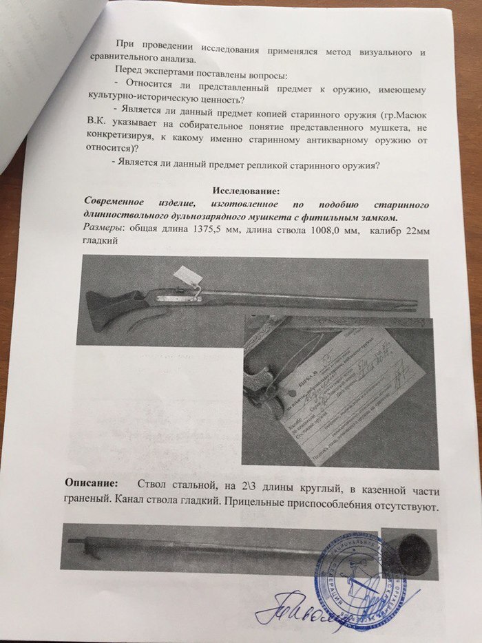 Для ответа на вопрос, является ли мушкет огнестрельным оружием и есть ли основания для уголовного дела, адвокат Масюка сделал запрос в Государственный Исторический Музей. Тот самый, где хранится немало подобных мушкетов и прочих принадлежностей древних войн. Было получено экспертное заключение: представленный на экспертизу предмет – самодельная копия фитильного мушкета XVI-XVII века, однако к категориям раннего огнестрельного оружия не относится, так как не отвечает нужным требованиям...