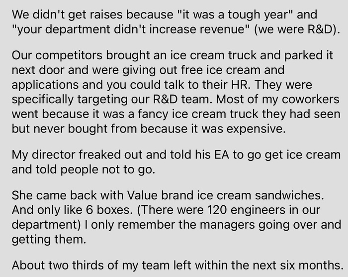 Наши конкуренты привезли фургончик с мороженым, припарковали его по соседству и раздавали бесплатное мороженое и анкеты, чтобы мы могли поговорить с их отделом кадров. Они специально нацелились на нашу команду R&D. Большинство моих коллег пошли, потому что это был шикарный фургончик с мороженым, который они видели, но никогда не покупали оттуда, потому что там все было достаточно дорогим.