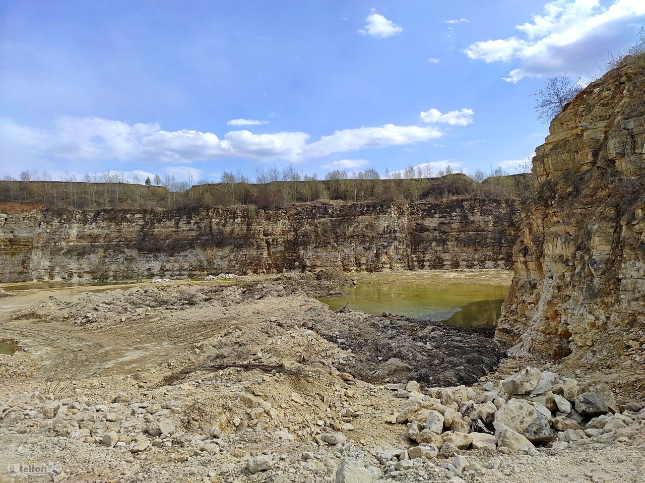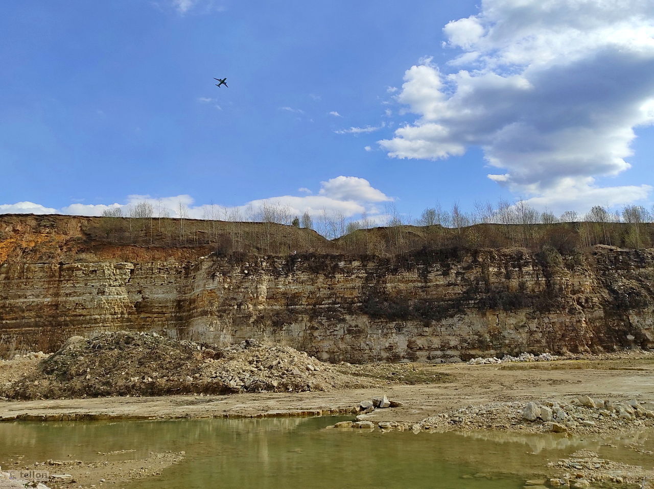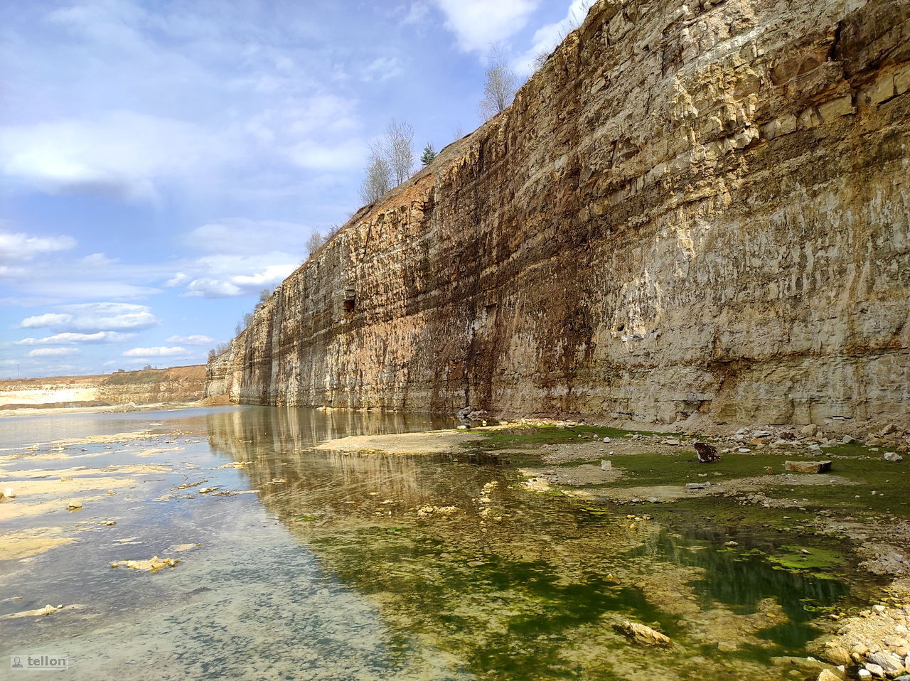Это территория известнякового карьера. Сейчас здесь запустение, можно погулять вдоль высоких обрывистых стен. Следов древних организмов мы не нашли, просто на камни смотрели. Белый известняк переслоен здесь с магматическими породами, а влага выносит на поверхность красные и черные потёки