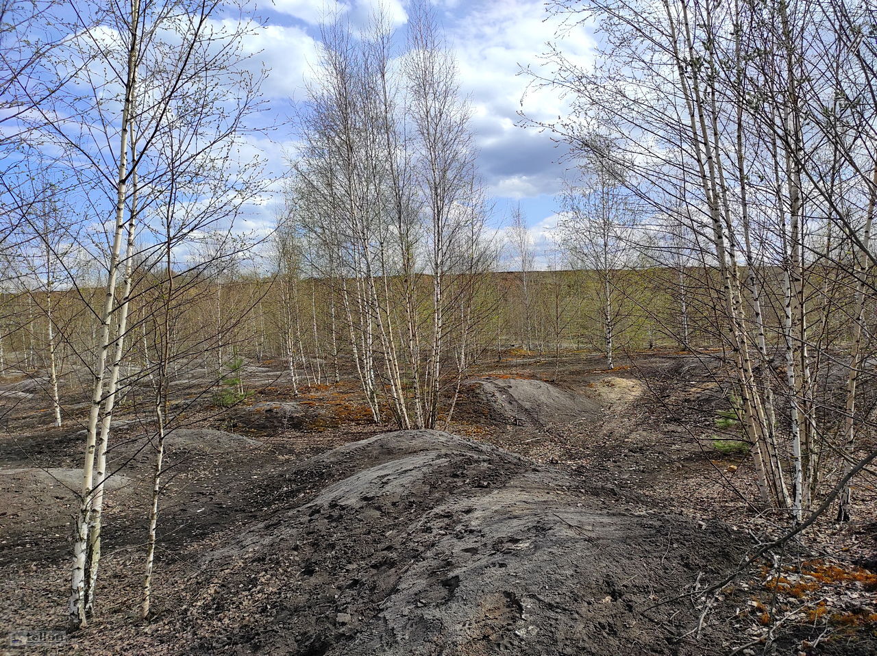 Ещё одним бонусом стал путь между оврагом и стратотипом. Этот карьер служил не только местом добычи камня, но и местом, куда асфальтовый завод свозил свои отходы. В результате локально получился странный ландшафт: серые гаревые холмы, без травы, с тонкими берёзками и цветным мхом: