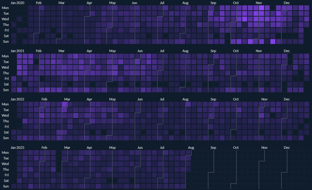 Пустые квадратики, это дни когда я не стримил. В среднем это 1 день в неделю, отдыхаю в пятницу, но т.к стримы ночные, то тут засчитывает это как пропуск субботы. Средняя длительность стрима - 6 часов.