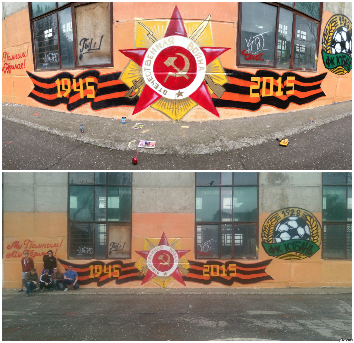 4 SimpleD10 Стрит-арт к Празднику Великой Победы 10 лет назад Немного с опозданием, но на ваш суд небольшой кусок к 70-летию Великой Победы. Авторство за мной и моей командой. зы: эмблема Кубани осталась с прошлого куска [моё] 9 мая - День Победы Граффити Стрит-арт
