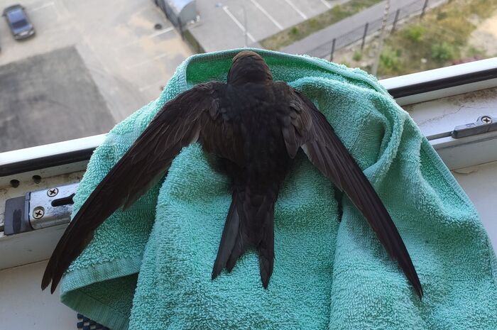 Скидывать вниз я не рискнул, мало ли, а вдруг крыло вывихнуто или сломано, решил вынести на улицу. Уже в подъезде он внезапно проснулся и начал активно пытаться выбраться из тряпочки, но я бегом дотащил его до первого этажа, где он выбрался сперва на ладонь, потом зацепился коготками за палец, а после спорхнул и полетел через двор.