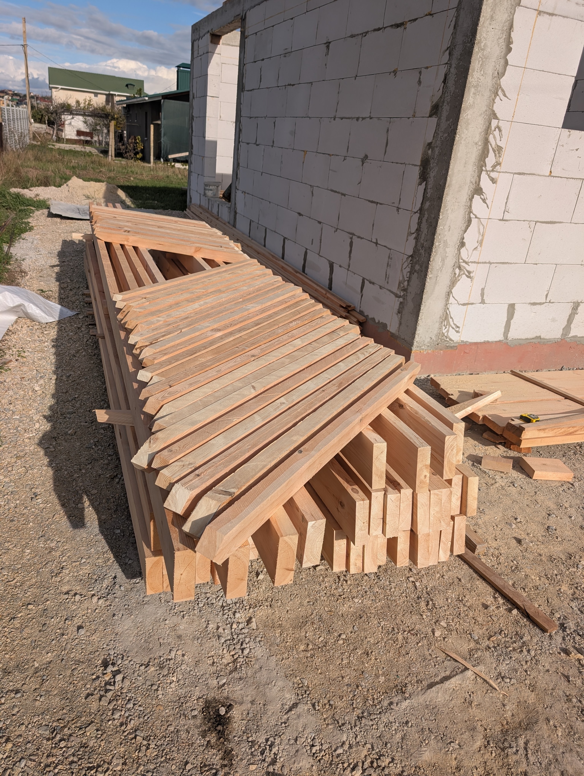Собрали, склеили, сложили. Получилось 11 ферм. Дальше предстоит поработать с краном. Звучит уже веселей и интересней. Чуть не забыл, надо ещё прикрутить маурэлат, если я правильно его называю. В общем, доску 50*150 к поясу.