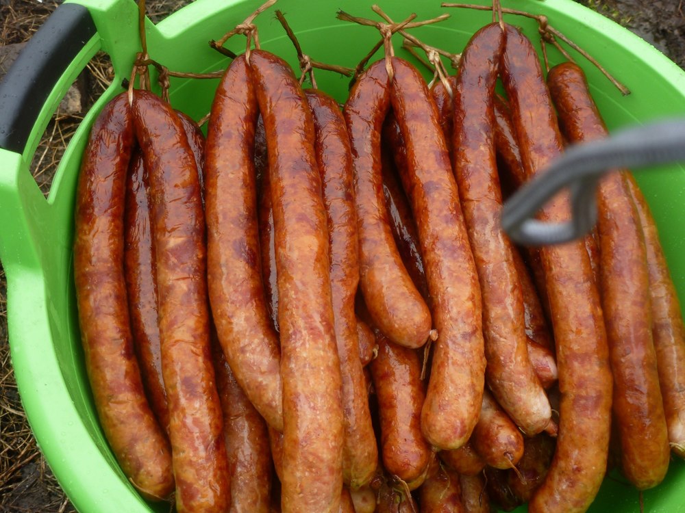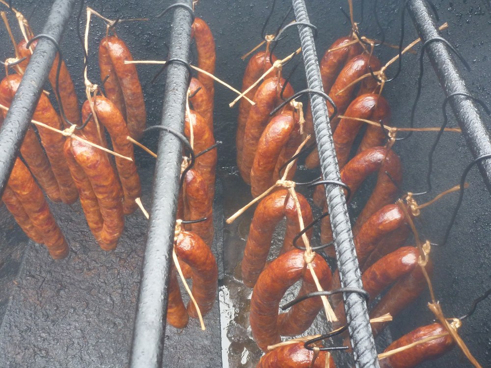 Опилки для копчения не используются. В обычной печке сжигаются дрова, по короткой, метра 2, трубе, дым поступает в стальной короб. Важный момент: ни в коем случае нельзя использовать березу или хвойные породы. Я пользуюсь осиной, и вполне доволен результатом. В том месте, где труба выходит в короб, нужно поставить максимально большой зонт, чтобы дым равномерно рассеивался по коробу. Внутри все просто, сало вешается на крюки и на перекладины.