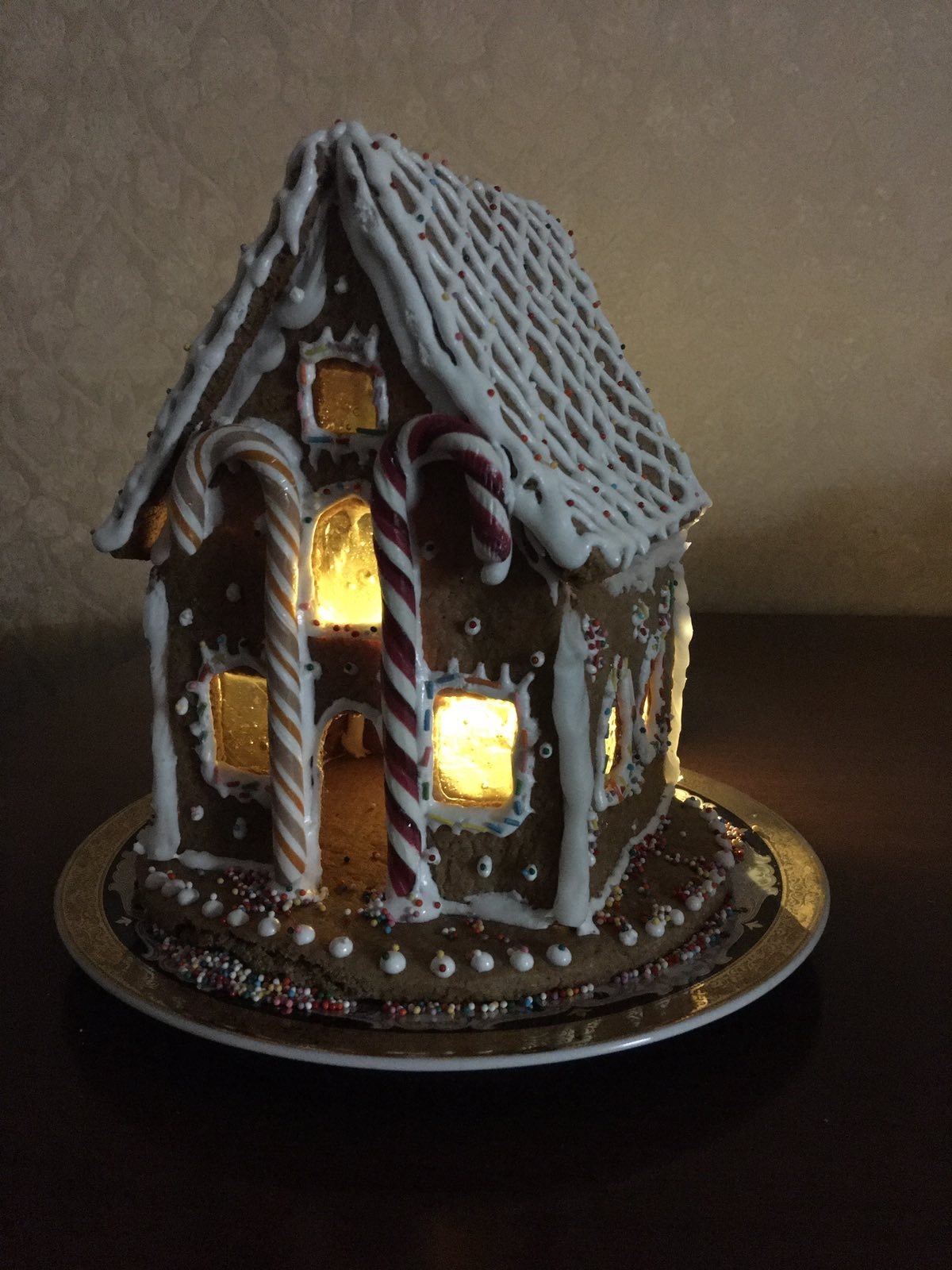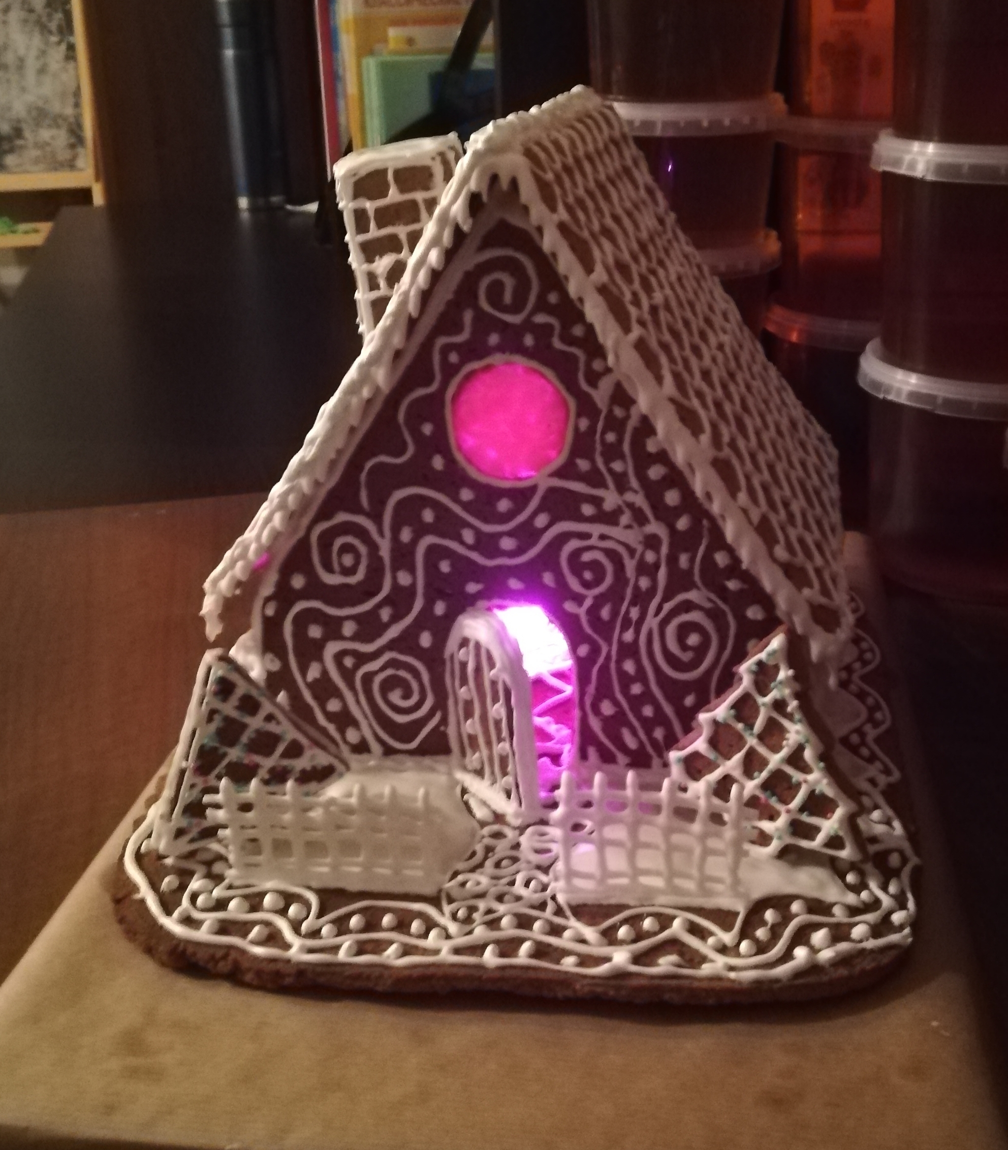 Домик гораздо лучше смотрится с подсветкой. Вы же вырезали в основании отверстие? Теперь в него можно вставить подсветку. Для большого дома я паял целую конструкцию из проволоки на которой были расположены 16 красных и желтых светодиодов. Все светодиоды были через резисторы на 200 ом соединены параллельно и подключены к старому зарядному устройству от телефона (5 вольт). В принципе и для маленького домика можно сделать аналогичную конструкцию (если владеете паяльником). Но проще всего, подсунуть внутрь часть елочной гирлянды (для этого домик удобнее будет установить на подставку, сделанную из крышки от картонной коробки) . И домик сразу станет обитаемым!