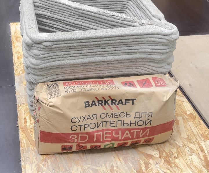 Материал для печати: песок + цемент + керамзит + добавки. Максимальный загружаемый объем - 10 кг. За одну загрузку состава в бак можно изготовить простой вазон, а для печати крупных объектов нужно подключать замешивающую машину.