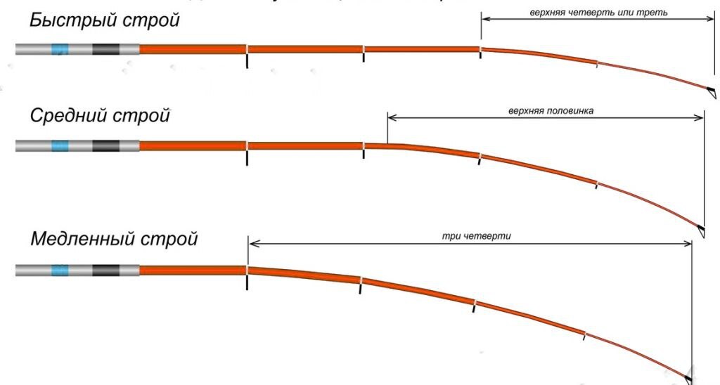 Строй удилища — это характеристика, описывающая то, насколько быстро и в какой части бланк (хлыст удилища) сгибается под нагрузкой и возвращается в исходное состояние.
