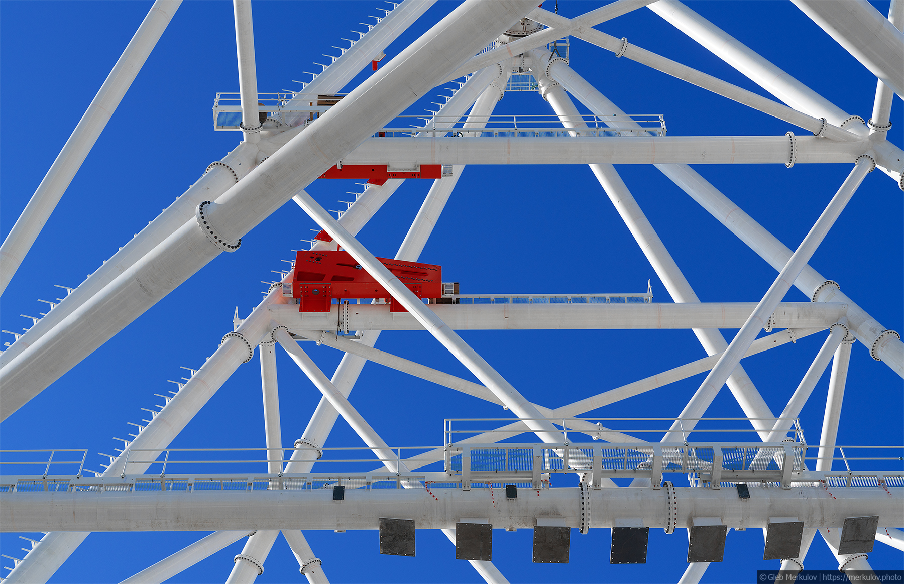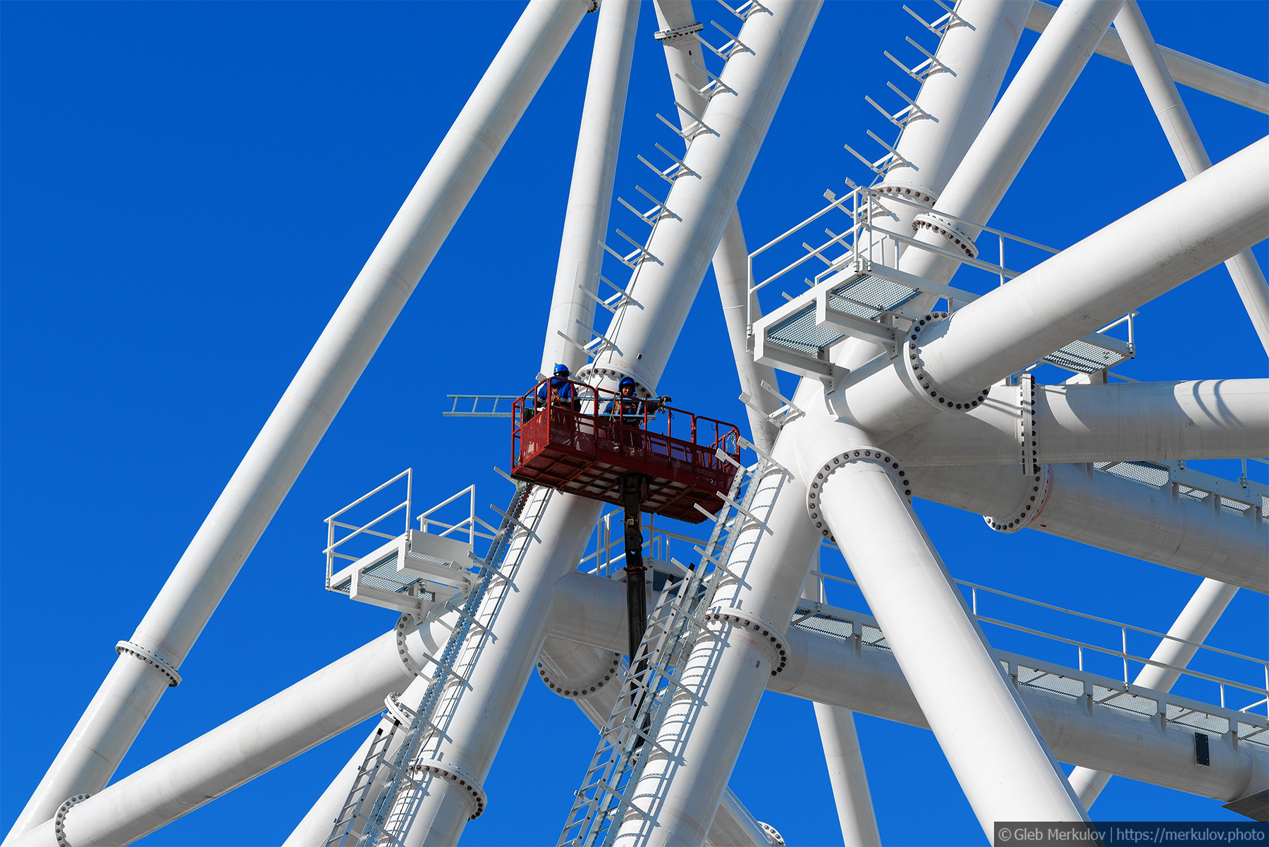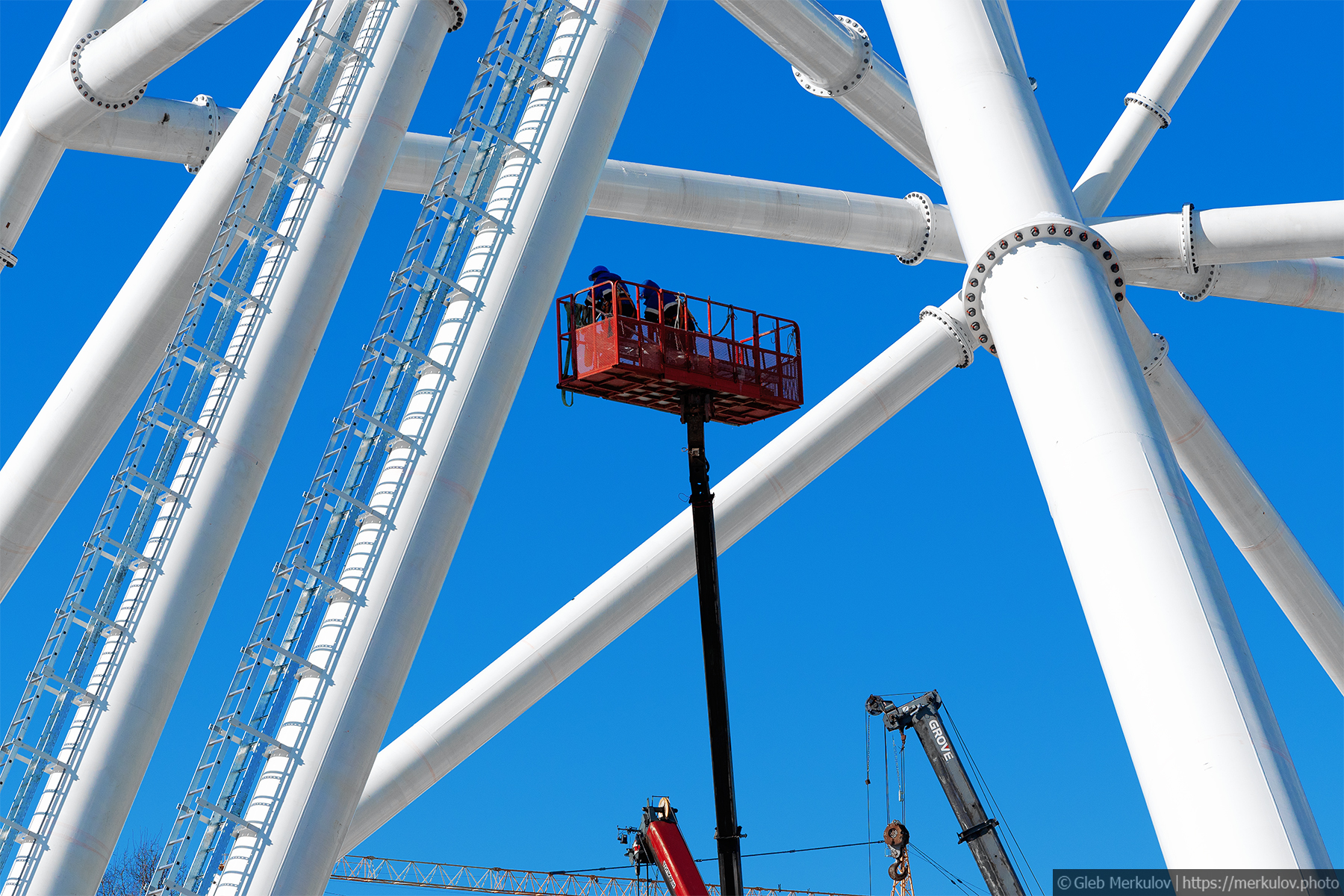 На прошлой неделе, меня пригласили снять процесс стройки нового Колеса Обозрения на ВДНХ - на данный момент процесс установки опорных конструкций идет к завершению, и до начала лета планируется закончить установку самого "колеса". Финальная высота нового аттракциона должна достигнуть 140м, что сделает его самым высоким в Европе. Стоять колесо будет около Южного входа на ВДНХ, где раньше был заброшенный недостроенный торговый центр.