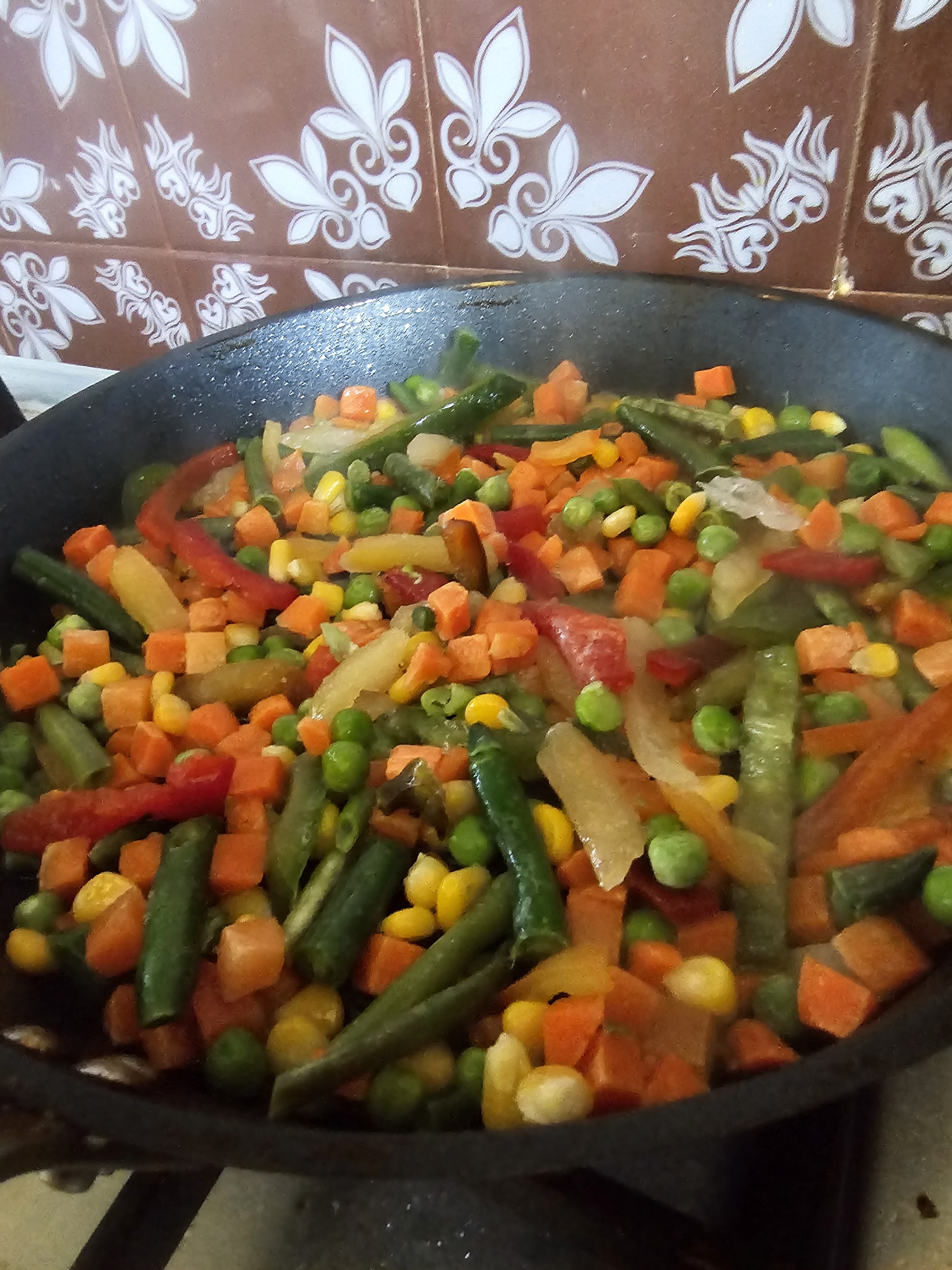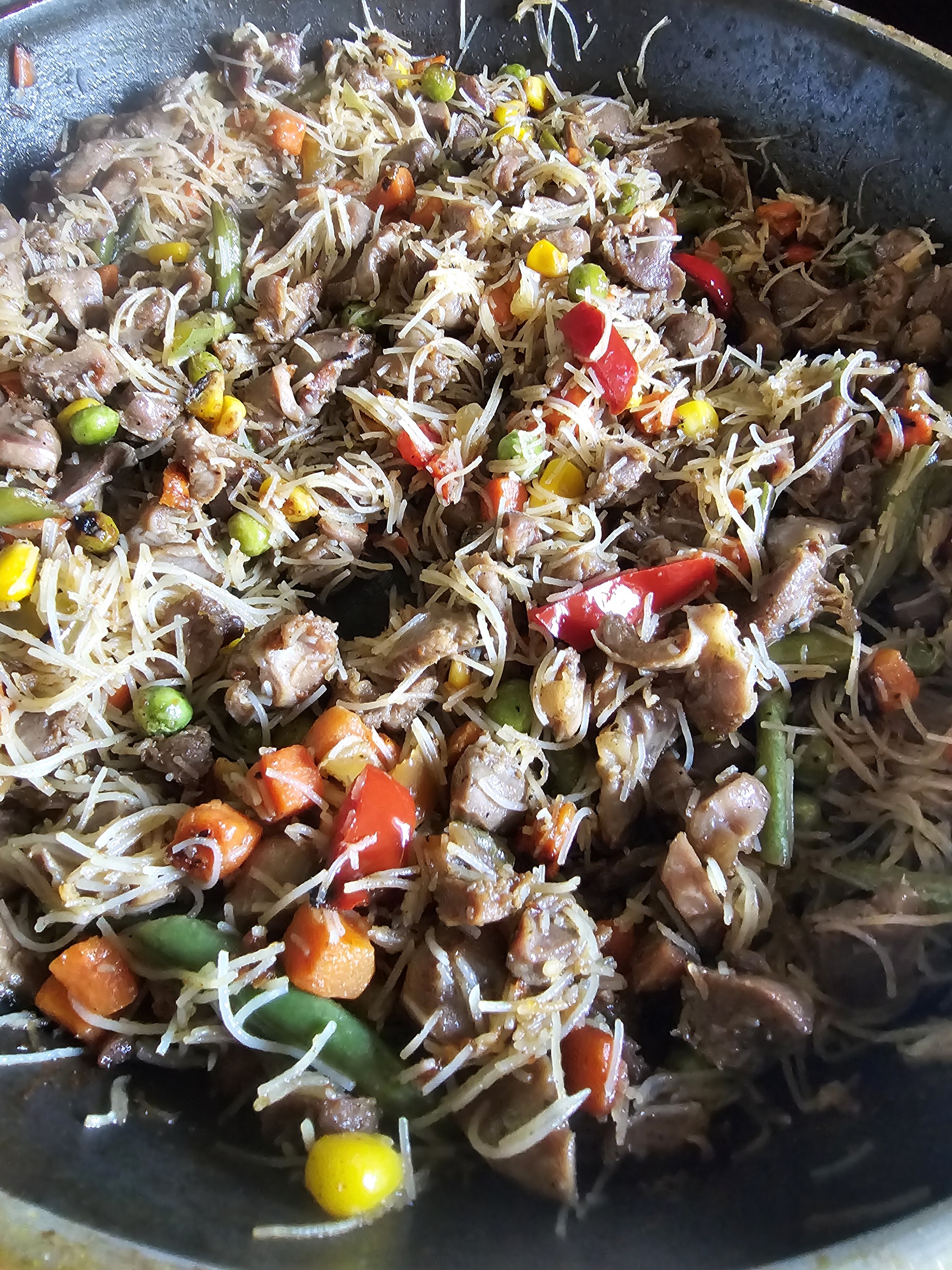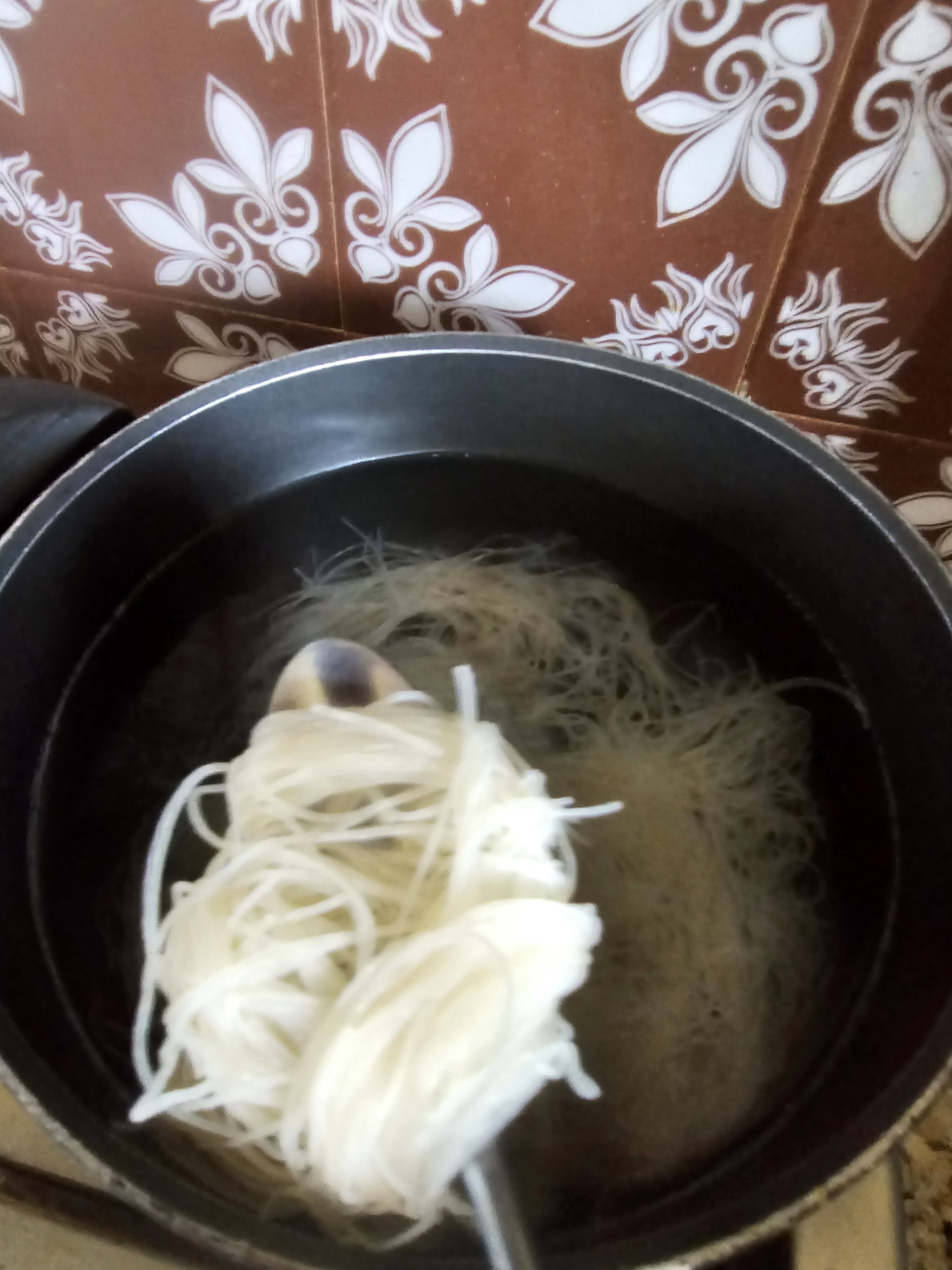 Половина пакета стеклянной лапши,бобовой,рисовой или любой другой белой,по вкусу один-в-один... У меня рисовая. Варим минуты 2-3. Потом смешаем со сборной солянкой и она дойдёт, еще и впитает вкус нашей зажарочки👍