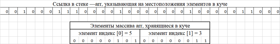 Вот так будет выглядеть массив в памяти компьютера. Здесь, значение ссылки приведено для наглядности и не соответствует действительности