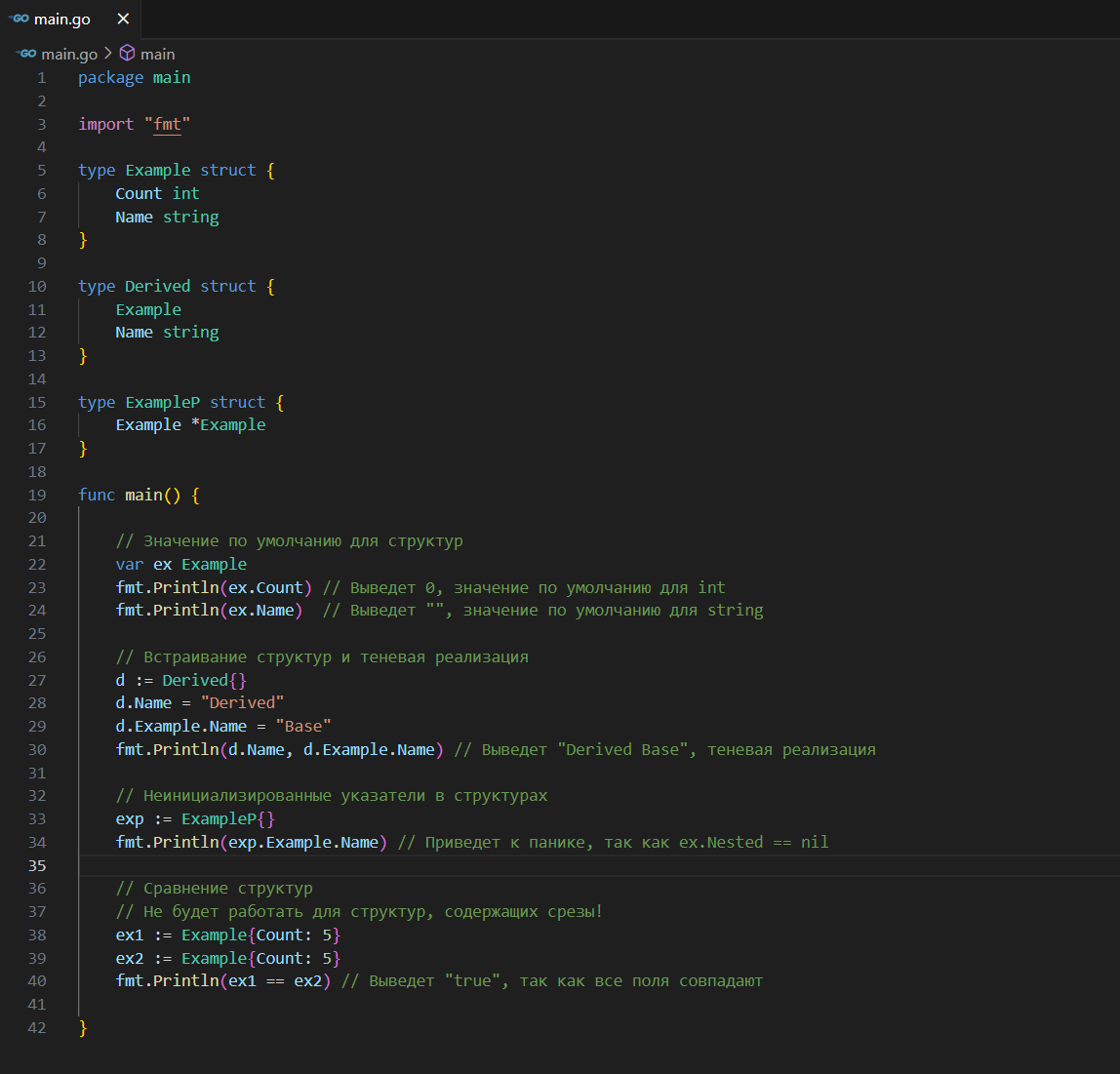 fmt.Println(ex1 == ex2) // Выведет "true", так как все поля совпадают