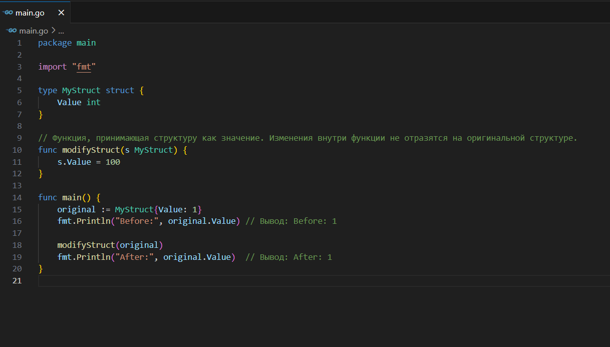 В Go, когда вы передаете структуру в функцию, по умолчанию происходит её копирование. Это значит, что внутри функции создается локальная копия структуры, и любые изменения, сделанные в этой копии, не отразятся на оригинальной структуре. Это поведение соответствует передаче аргументов по значению.