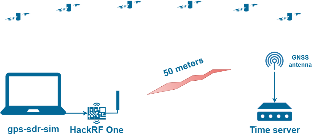 Дистанция атаки: примерно 50 метров, сильно зависит от условий распространения сигнала. Уровень выходной мощности HackRF One RMS для сигналов GNSS составляет около -10 dBm. Этого достаточно, чтобы подавить реальные сигналы в радиусе 5 км в прямой видимости.