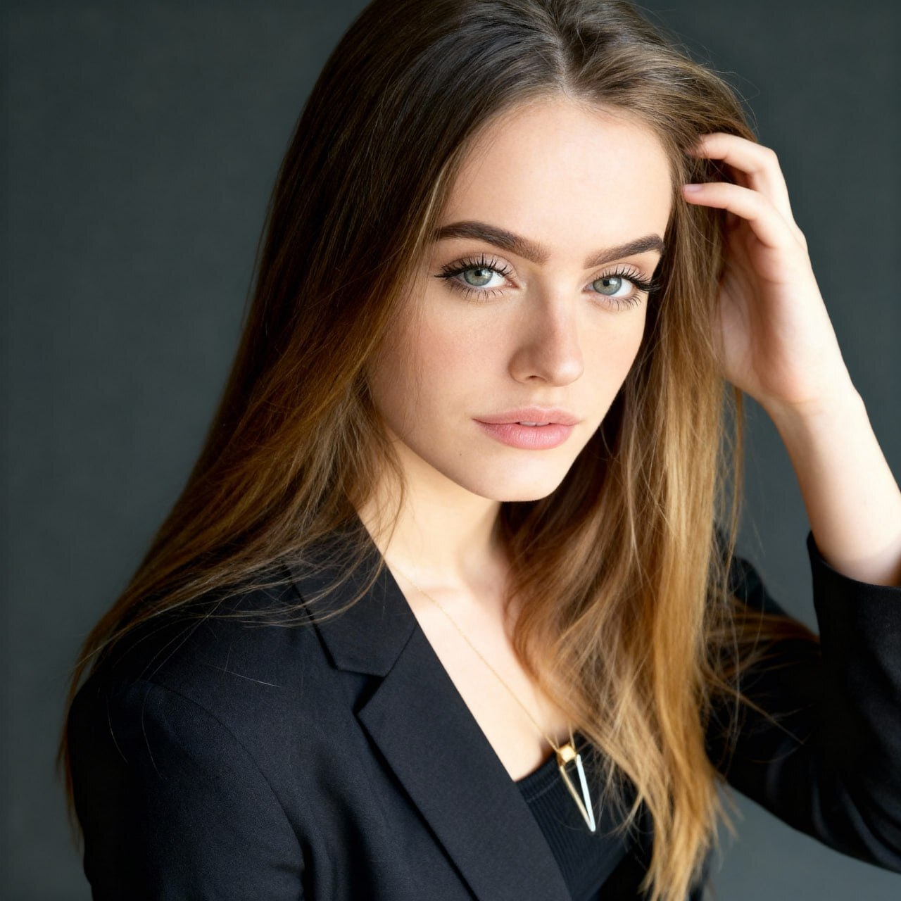 A professional, high-resolution, hyperrealism, profile photo, maintaining the exact facial structure, identity, and key features of the person in the input image. The subject is framed from the chest up, with ample headroom and negative space above their head, ensuring the top of their head is not cropped. The person looks directly at the camera, and the subject's body is also directly facing the camera. They are styled for a professional photo studio shoot, wearing a smart casual blazer. The background is a solid '# 141414' neutral studio. Shot from a high angle with bright and airy soft, diffused studio lighting, gently illuminating the face and creating a subtle catchlight in the eyes, conveying a sense of clarity. Captured on an 85mm f/1.8 lens with a shallow depth of field, exquisite focus on the eyes, and beautiful, soft bokeh. Observe crisp detail on the fabric texture of the blazer, individual strands of hair, and natural, realistic skin texture. The atmosphere exudes confidence, professionalism, and approachability. Clean and bright cinematic color grading with subtle warmth and balanced tones, ensuring a polished and contemporary feel.