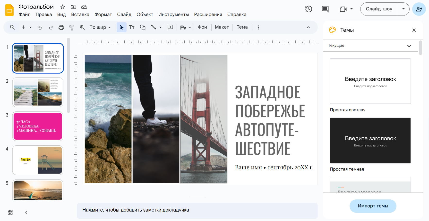 Google Slides — бесплатный аналог PowerPoint в облаке. Базовый функционал, но достаточный для большинства задач. Главные преимущества — доступность и совместная работа в реальном времени.