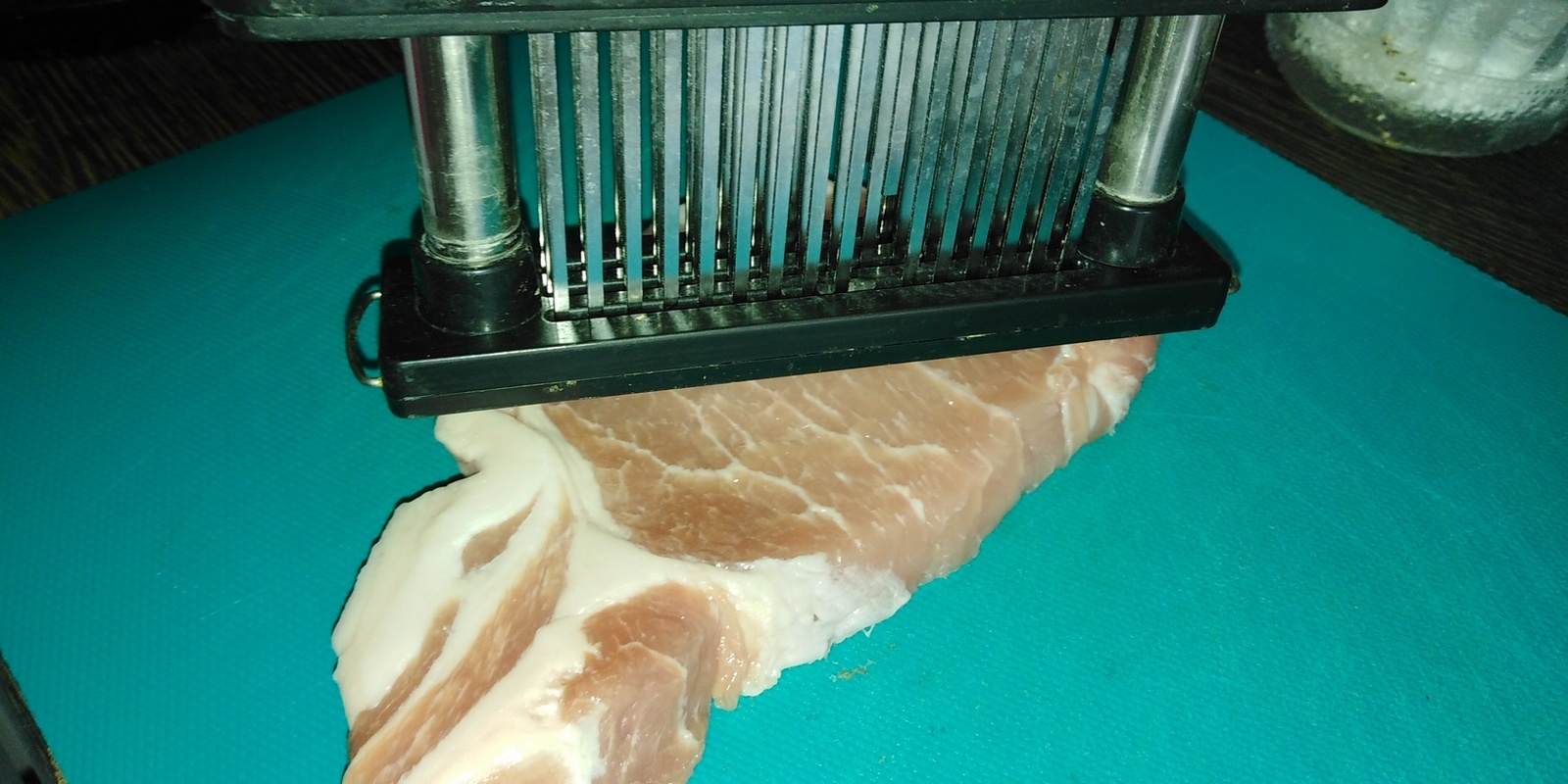 Корейку отбил с помощью вот такой приспособы. Мясо становиться очень мягким и легко откусывается после жарки.