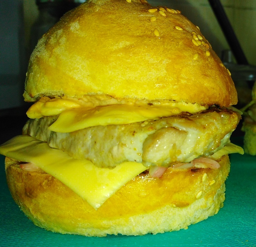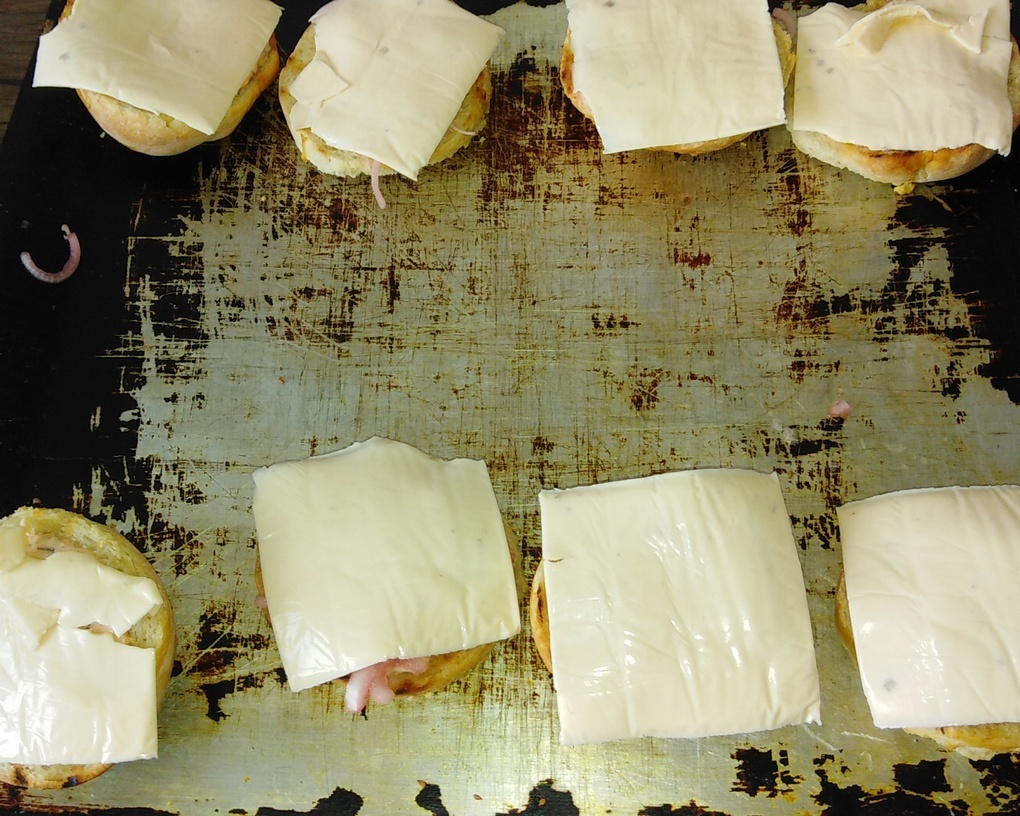 Потом на нижнюю булочку стэйк и закрыл верхней половиной. потом в духовку градусов 100 на 3-4 минуты. что бы сыр расплавился. И вуаля.