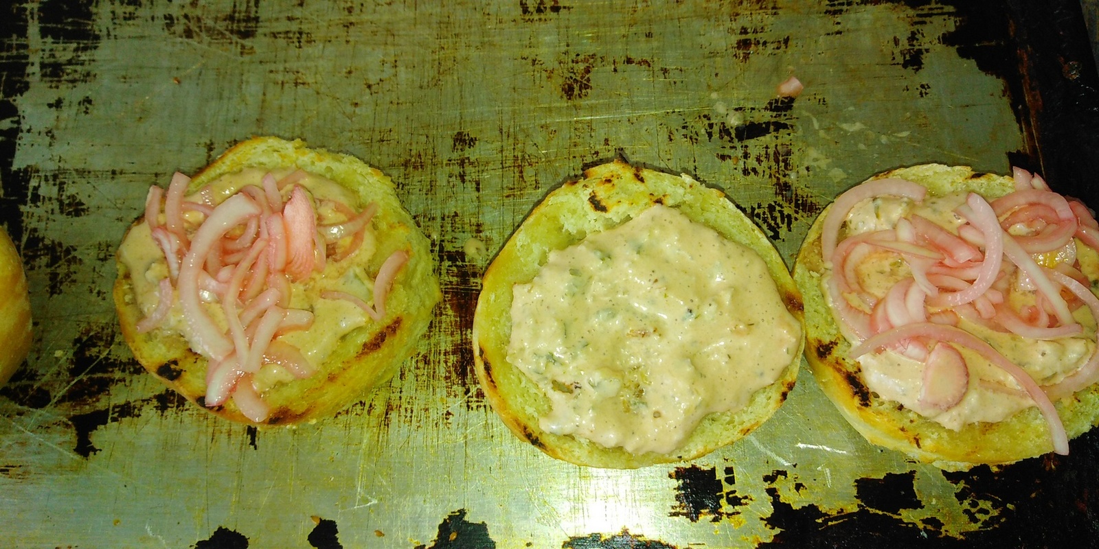 Начинаем сборку. Каждую половинку булочки смазал соусом. На нижнюю уложил маринованный лук.