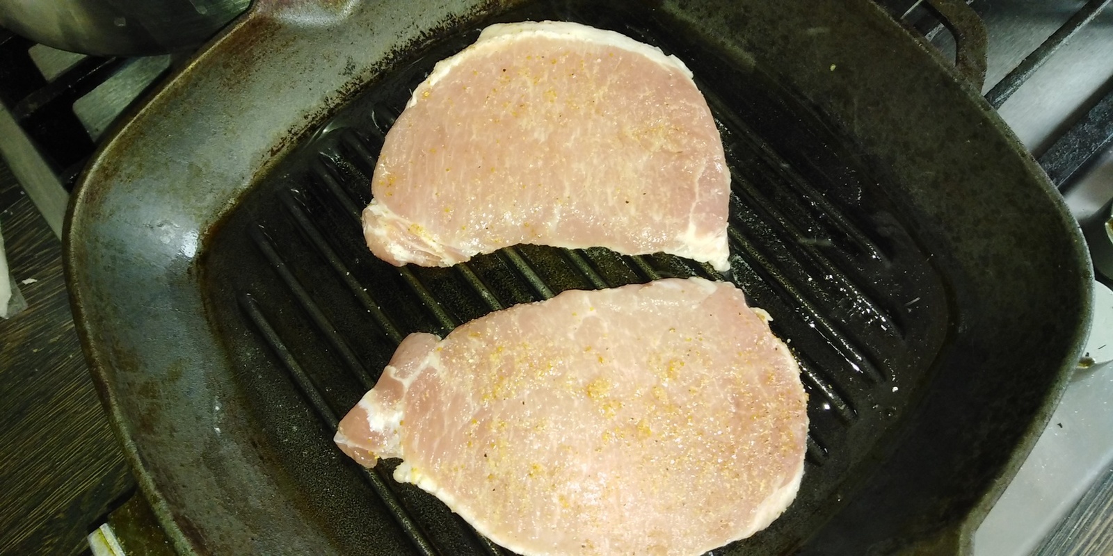 Посолил поперчил и посыпал сушеным чесноком. после чего обжарил как обычные стэйки на гриль сковороде по 4 минуты с каждой стороны.