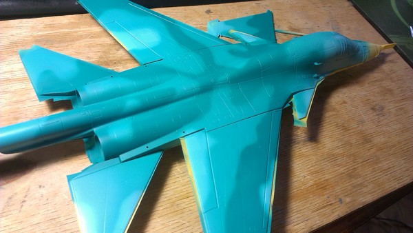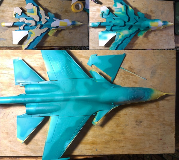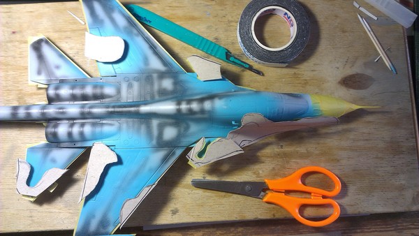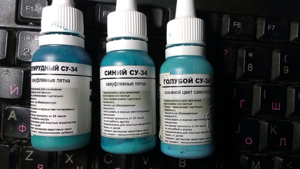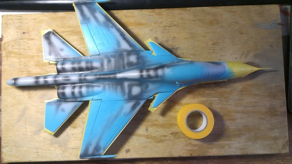 Красить в один цвет было как-то скучно и неспортивно, хотелось трехцветный камуфляж голубой-синий-бирюзовый, тем более что как раз такую машину я видел на авиашоу, после которого решил её строить. Покопался в интернетах, кое-как нашел пару фоток с нужными бортовыми номерами.