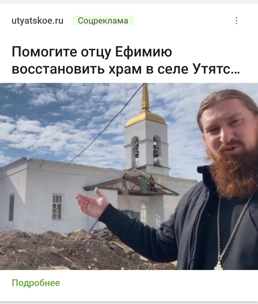 Возвращаюсь на Пикабу и листаю ленту дальше. Буквально через пяток постов мне попадается новый призыв помочь. В этот раз отцу Ефимию и не построить, а восстановить храм в каком-то селе с утиной этимологией.
