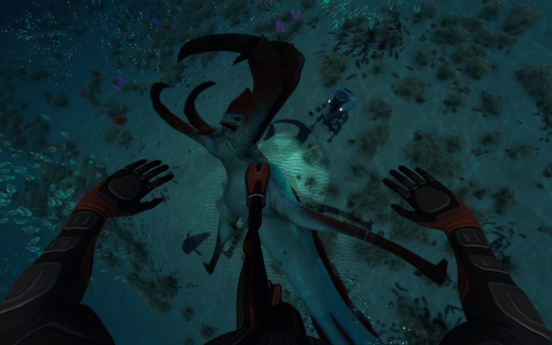 Море тут далеко не так безобидно, как может показаться на первый взгляд. Оно кишит живностью, которая не имеет ничего против ужина протагонистом. Или маленьким корабликом протагониста! Или экзоскелетом протагониста!! Или чёртовой подводной лодкой протагониста!!!