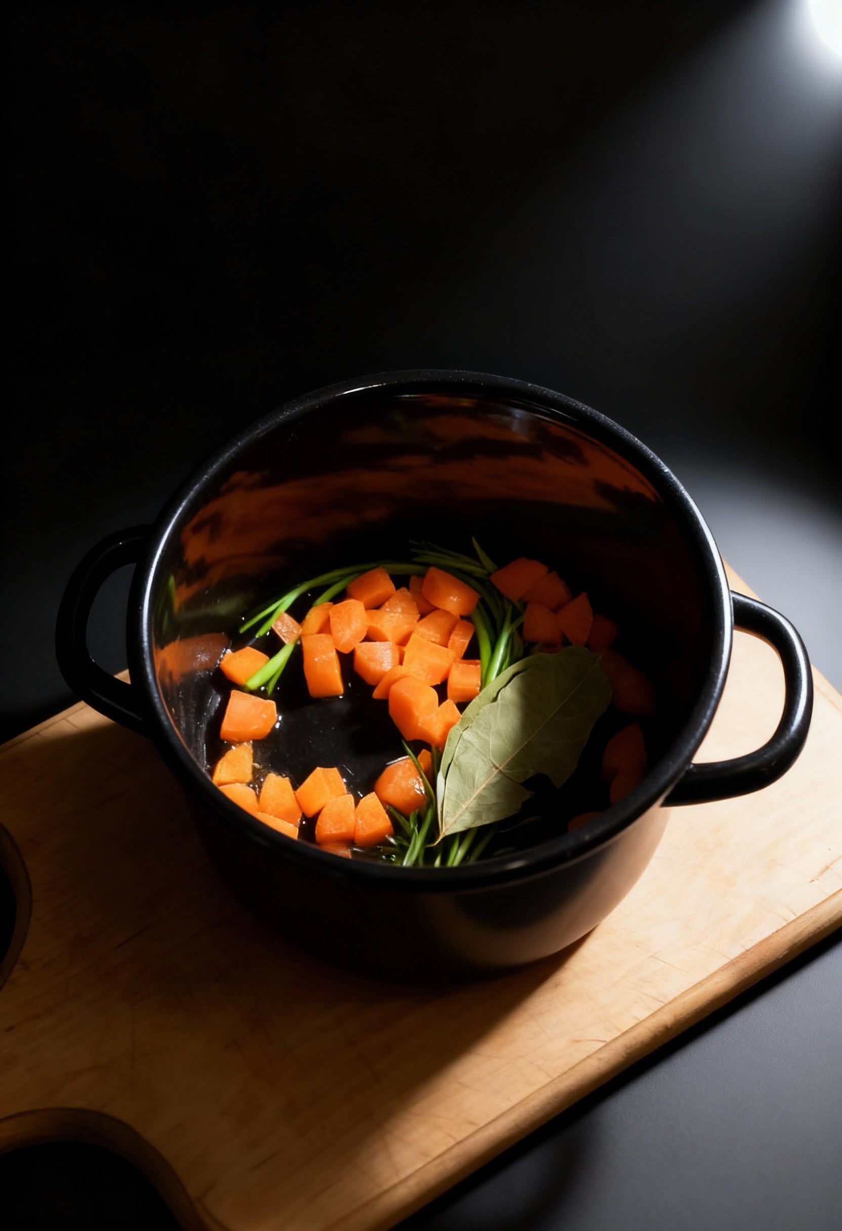 - В сотейнике или кастрюльке с толстым дном распускаем наш брусок сливочного масла. Добавляем очищенную и порезанную кусками морковь и все ароматные травы, собранные в пучок и перевязанные ниткой. Это называется букет гарни, если что. Все это дело припускаем на среднем огне. Главное, следить, чтобы овощи не начали поджариваться - они должны именно томиться, постепенно насыщая масло ароматами.