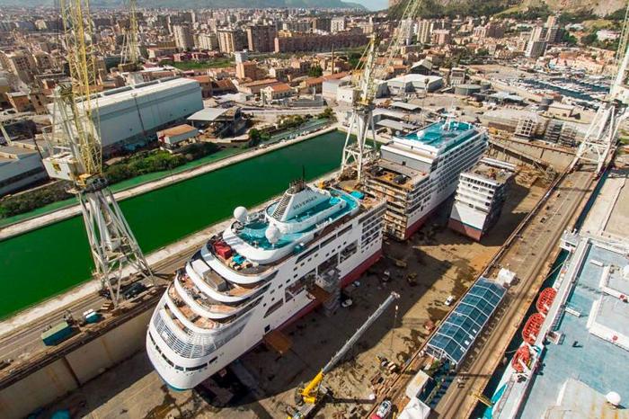 Могут разрезать напополам, чтобы встроить новые части - как на фото, где судостроители разрезали лайнер Silver Spirit пополам и вставляли 15-метровую сборную секцию в центральную часть судна.