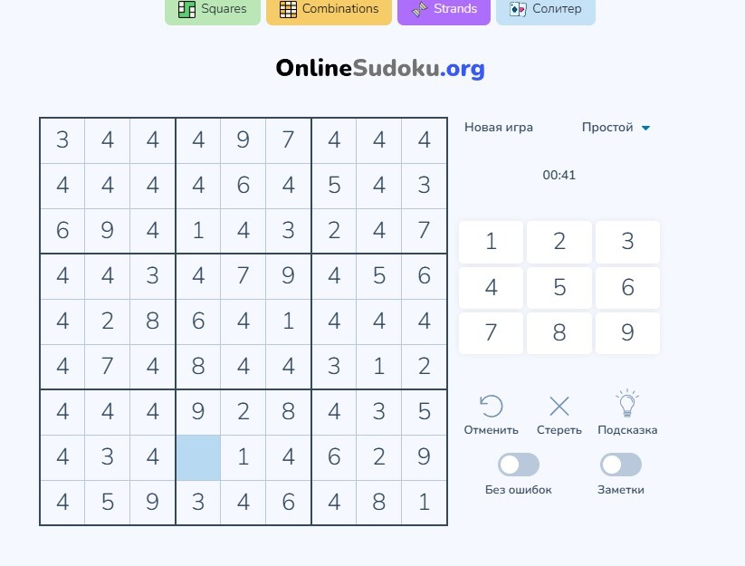 Так у тебя контроль ошибок отключён. Ты можешь при таком раскладе всё поле 4-ми засеять. Сам же накосячил.