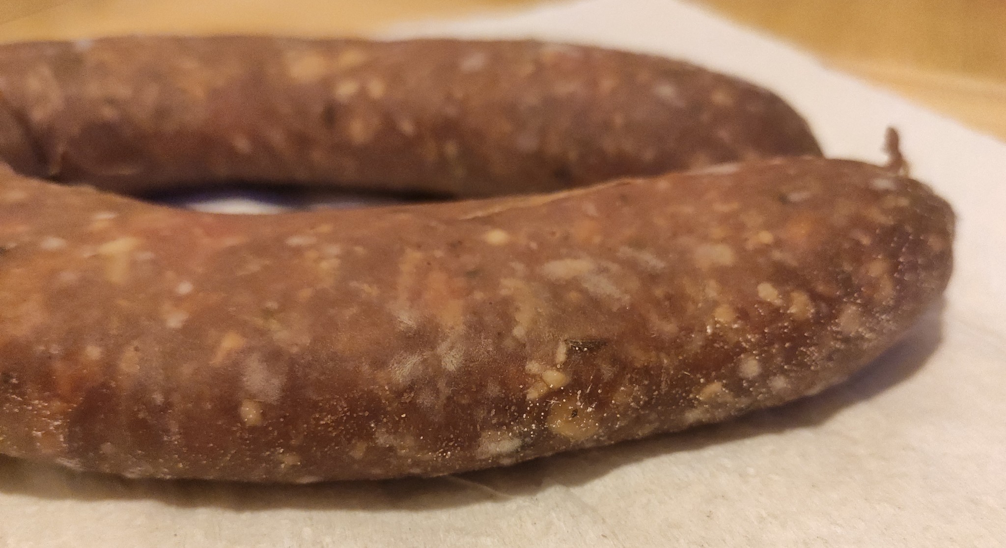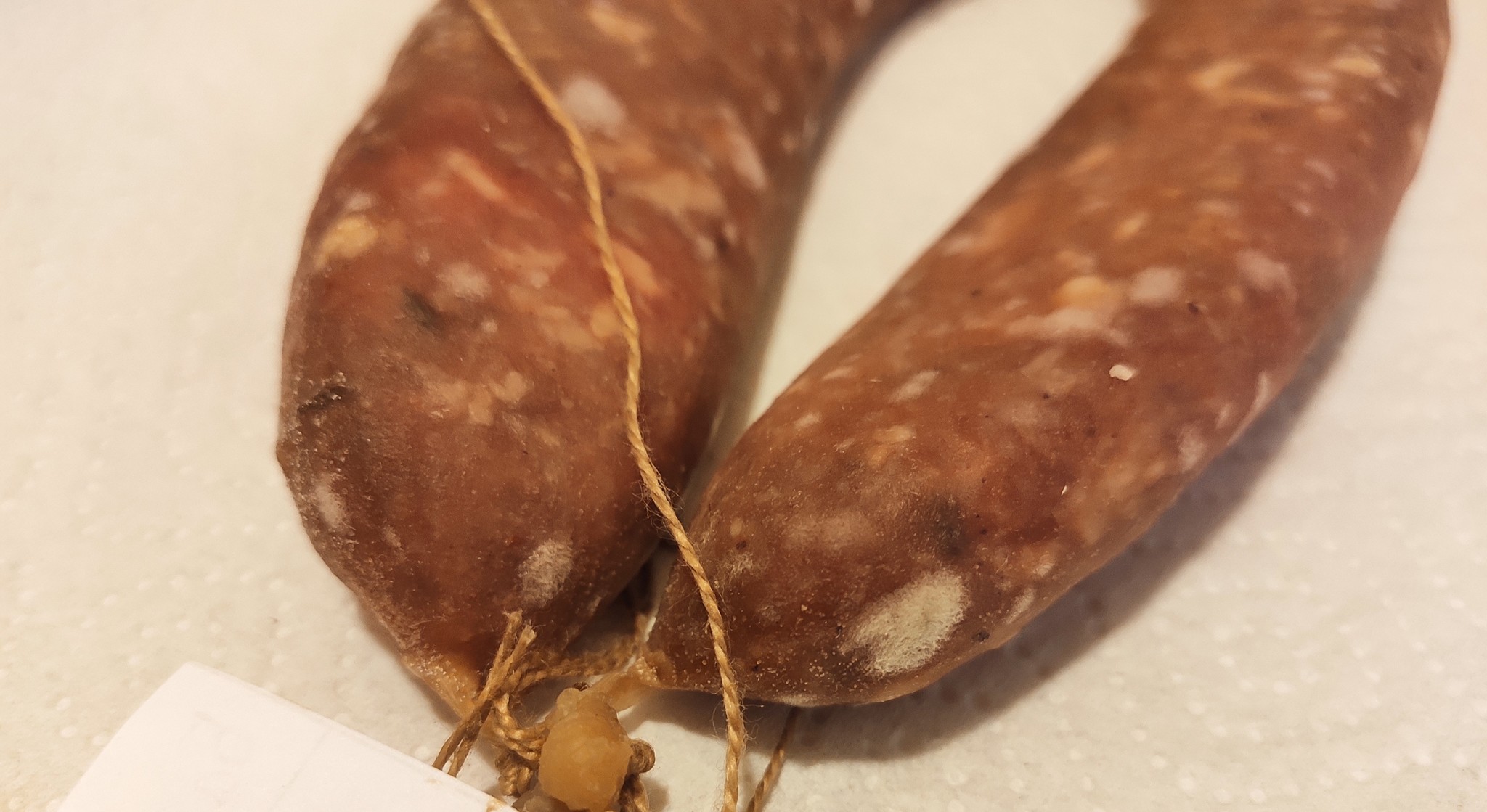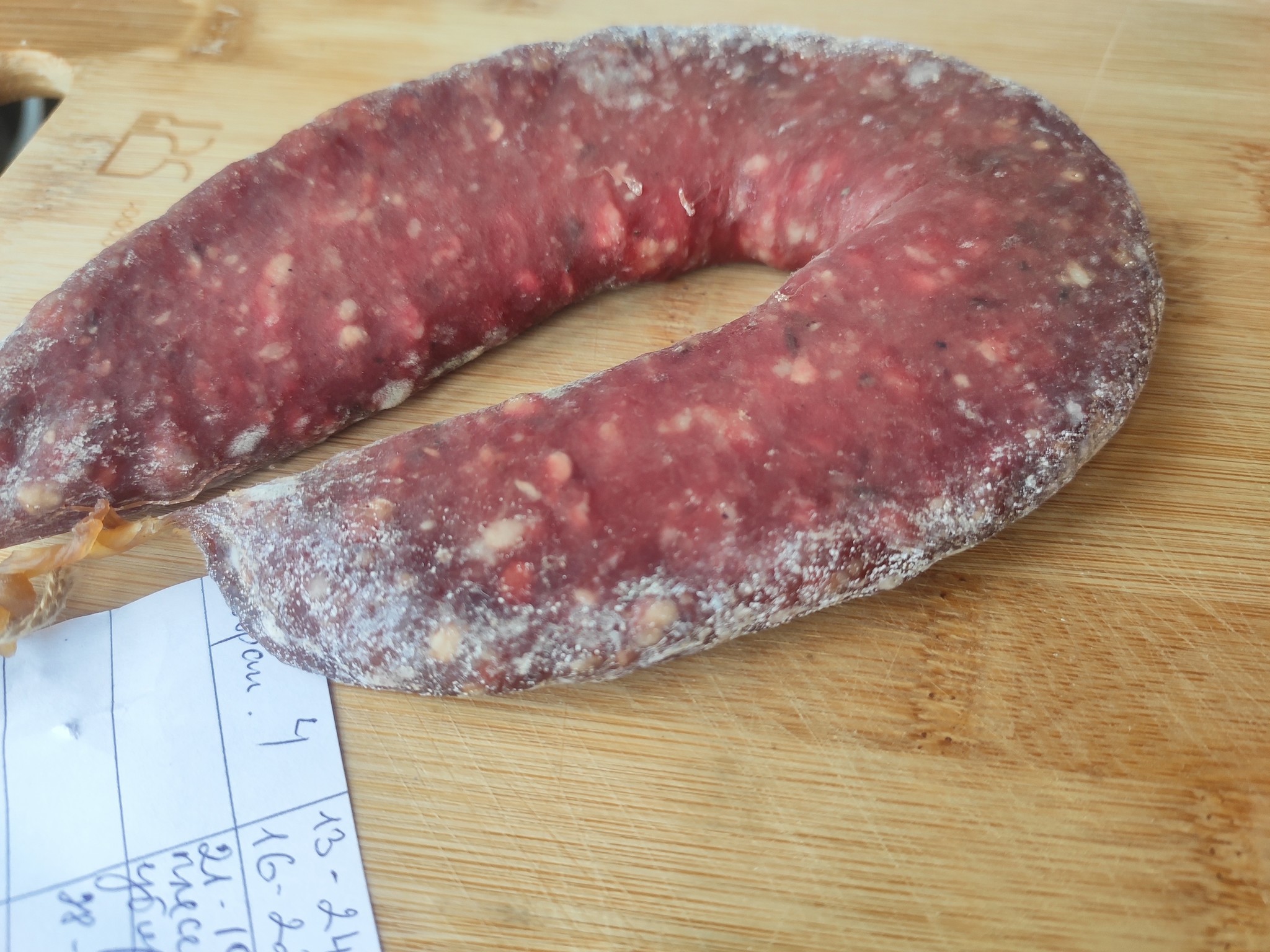 С суджука из говядины плесень смывать не стала, но также вывешивала вместе с остальными колбасками над окном, результат тоже порадовал. В холодильнике еще есть одна колясочка суджука из баранины, которую я не вывешивала и не смывала плесень, она менее красная. чем остальные и чуть мягче (потеря веса 41% на 28.01), пока оставлю дальше вялиться)