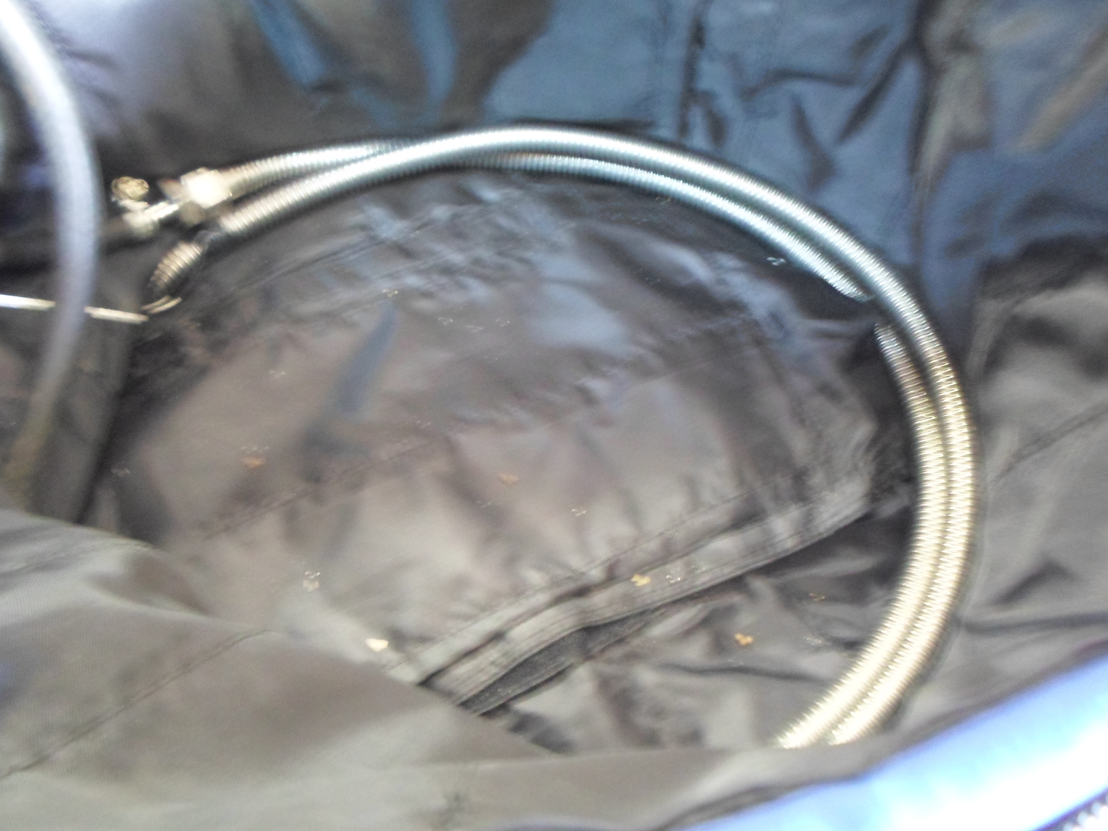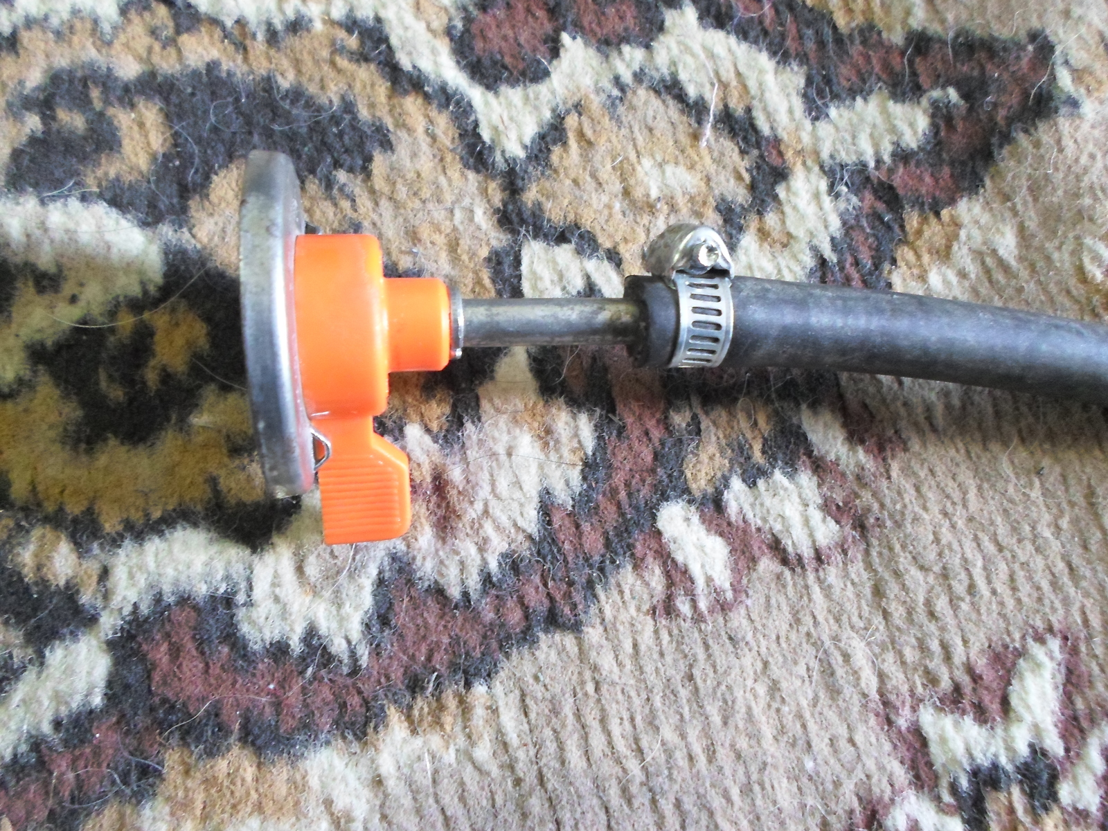 Испаритель представляет гофрированный металлический рукав длиной 3 метра с фитингами и продается в магазинах для подводки газа.В него вкручены два фитинга на полдюйма с ершом под резиновый шланг для газа диаметром 6 мм.На фитинги надеты два отрезка сварочного рукава длиной по 1 метру.Со стороны входа на рукав надет переходник под баллончик,сделанный из обрезанной газовой горелки с краном.