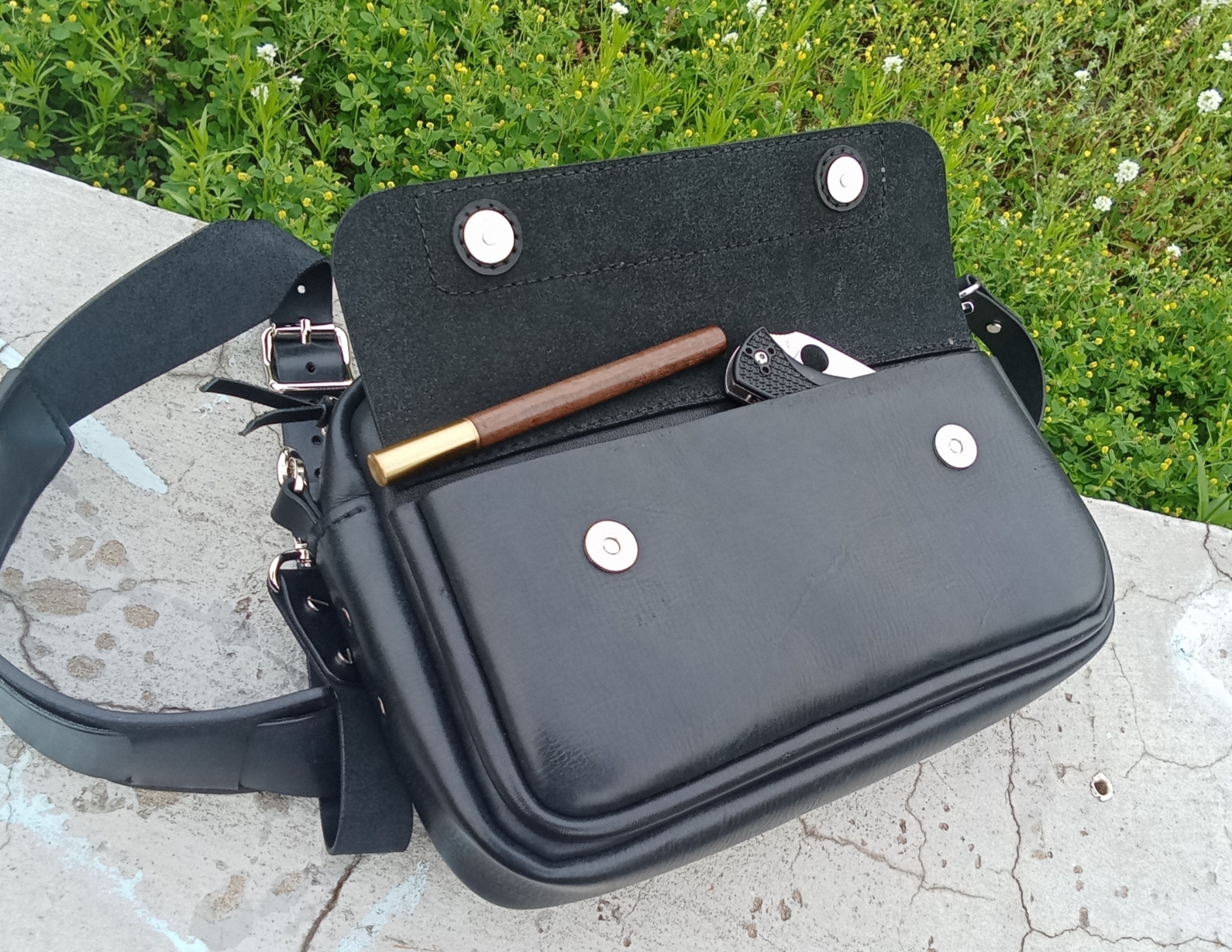Передний карман объемный, на магнитных кнопках. Внутри сумки одно отделение и плоский карман, на задней стенке расположен карман на молнии. Длина ремня регулируется при помощи двух пряжек.