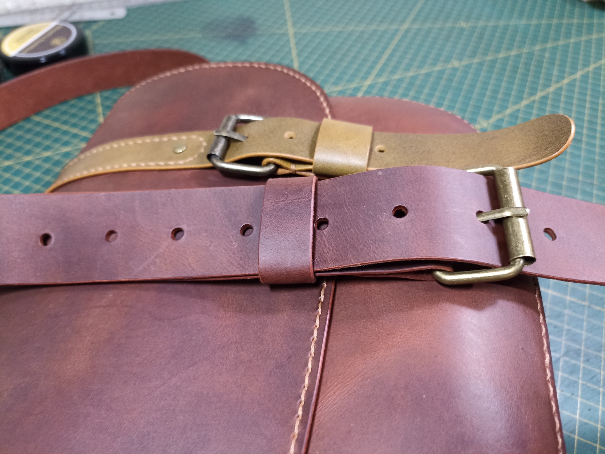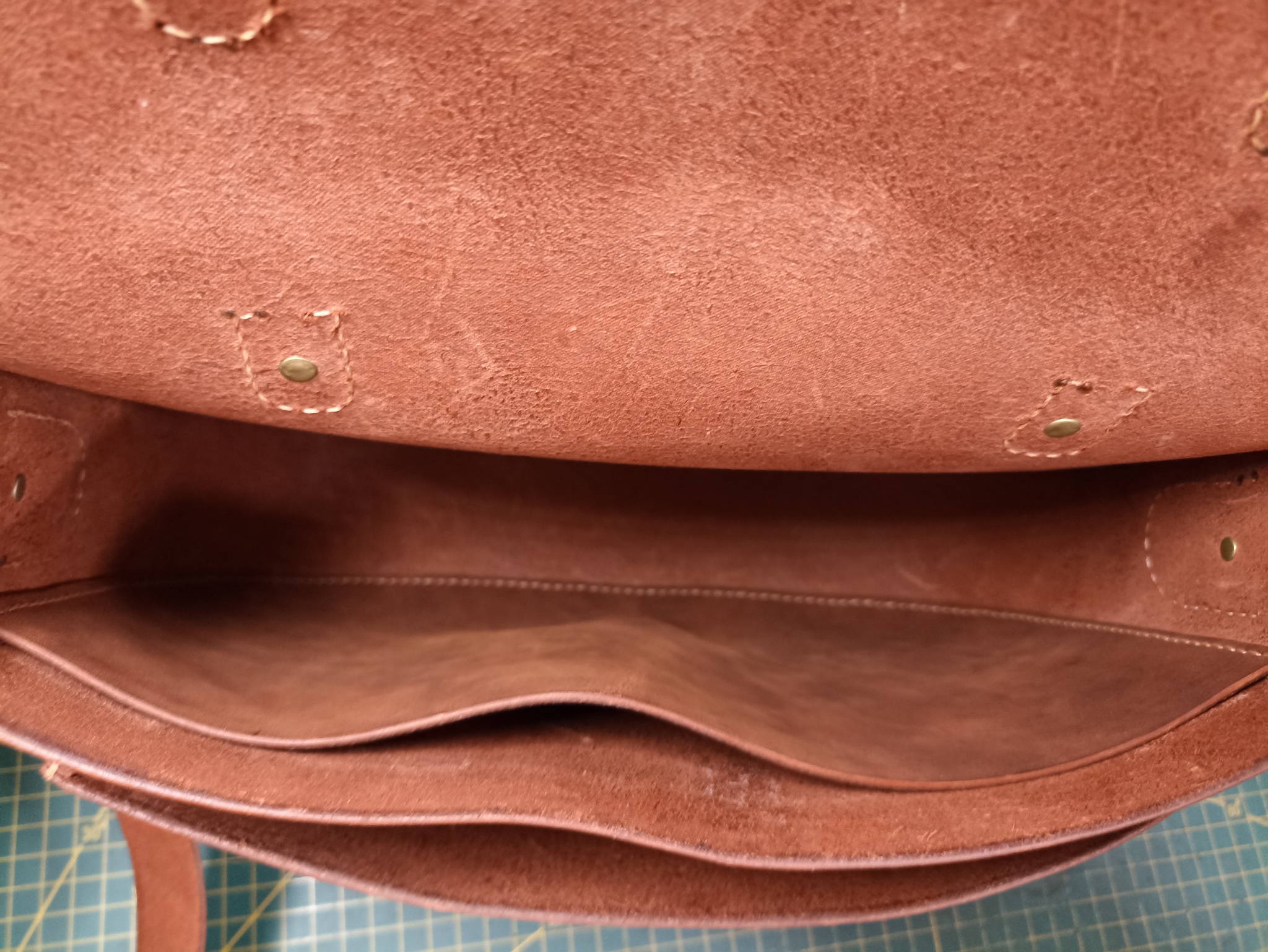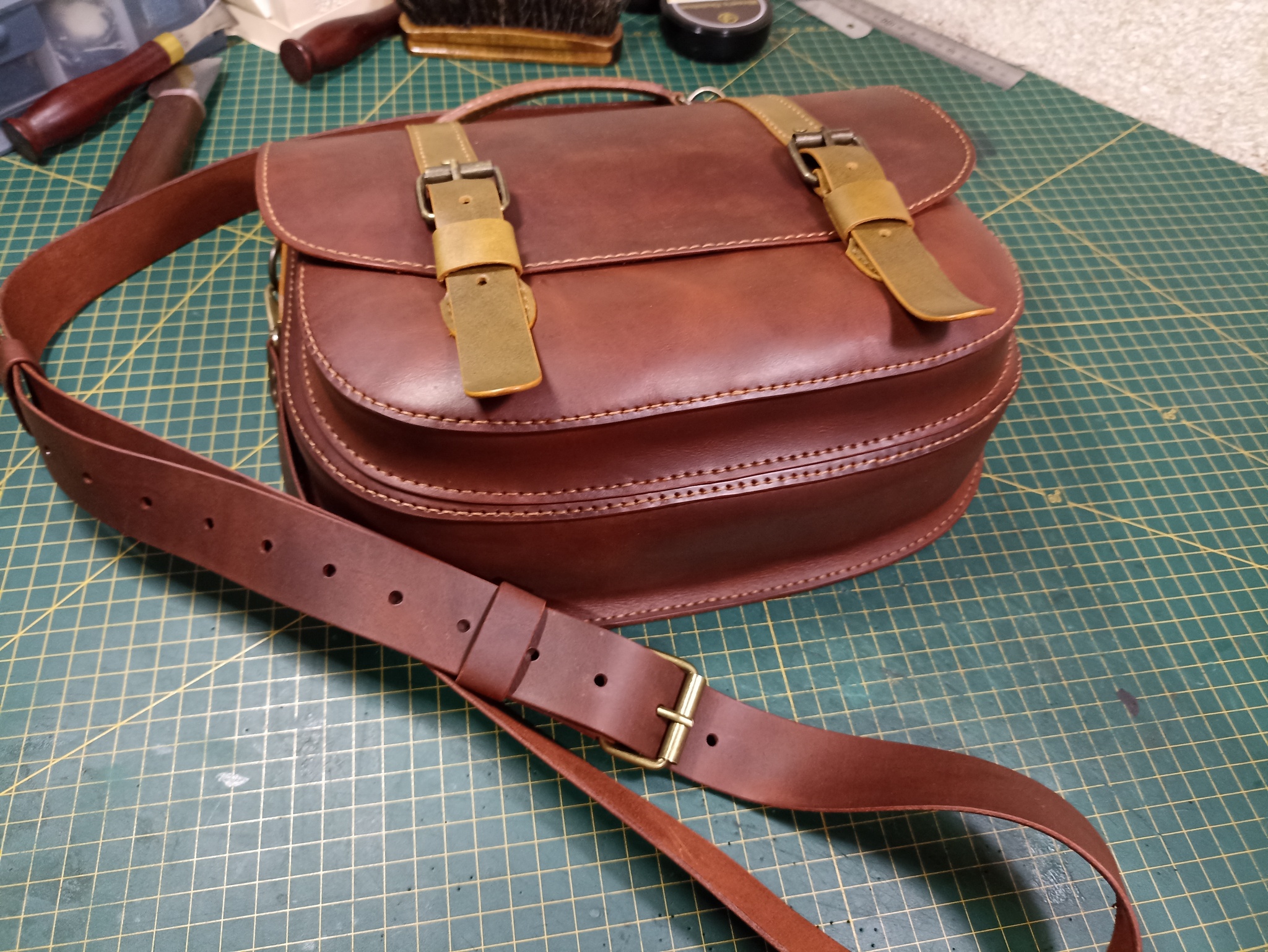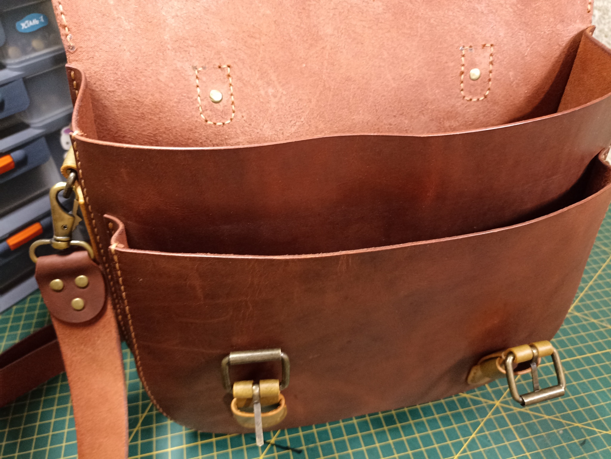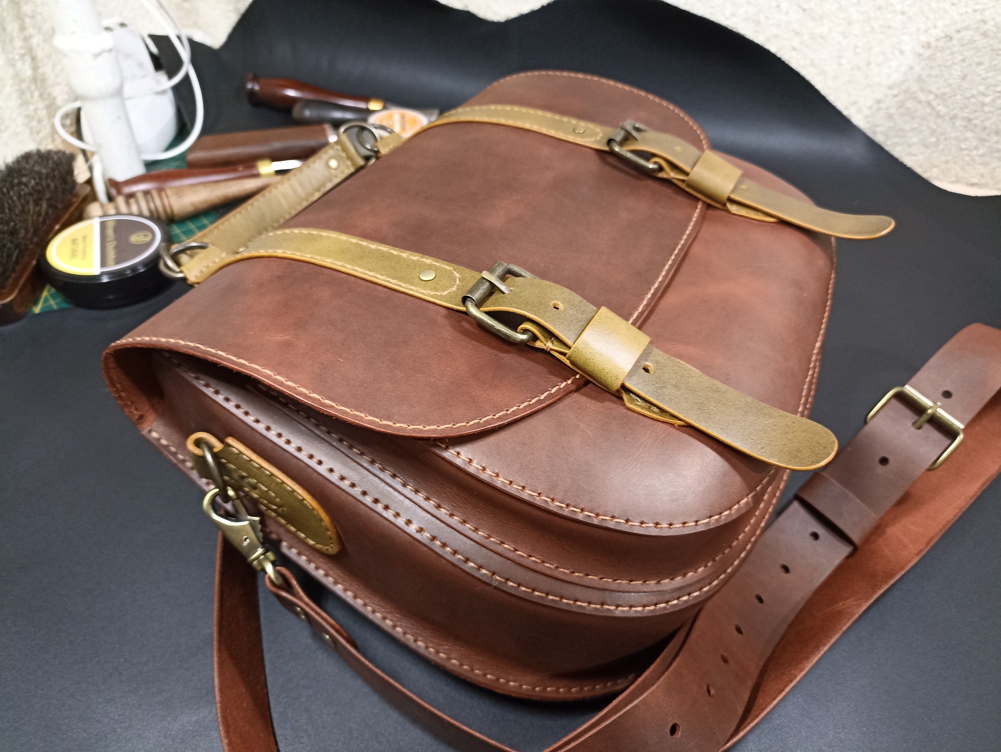 Сумка выполнена из твердой кожи хромового дубления в толщине 1.8мм, форму держит отлично. Шаг пробойника 5мм, нить 0.50мм. Финишно кожа обработана масловоском. Урезы обработаны токонолом и воском. На удивление, сумка получилась лёгкая, хотя кожа достаточно толстая. Сумка выполнена по бесплатной выкройке, честно скачанной с просторов интернета)