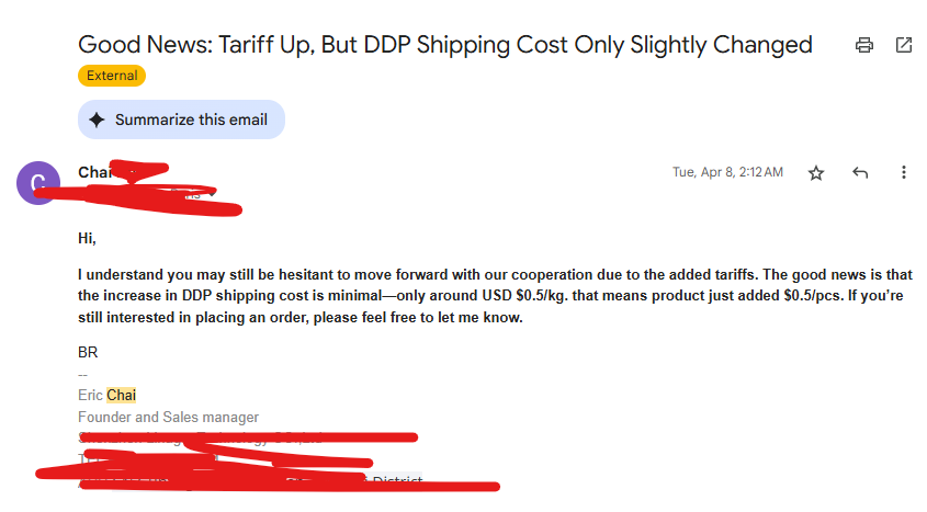 И вот, пошлины достигли 146% и Китаец говорит мол не волнуйтесь, повышение цены составит всего полдоллара за штуку, хотя по логике должно быть больше чем в два раза. И таких поставщиков у меня десятки, потому что это не то что китайцы сидят равнодушно и говорят платите или уёбывайте, они тоже ищут и предлагают решения.