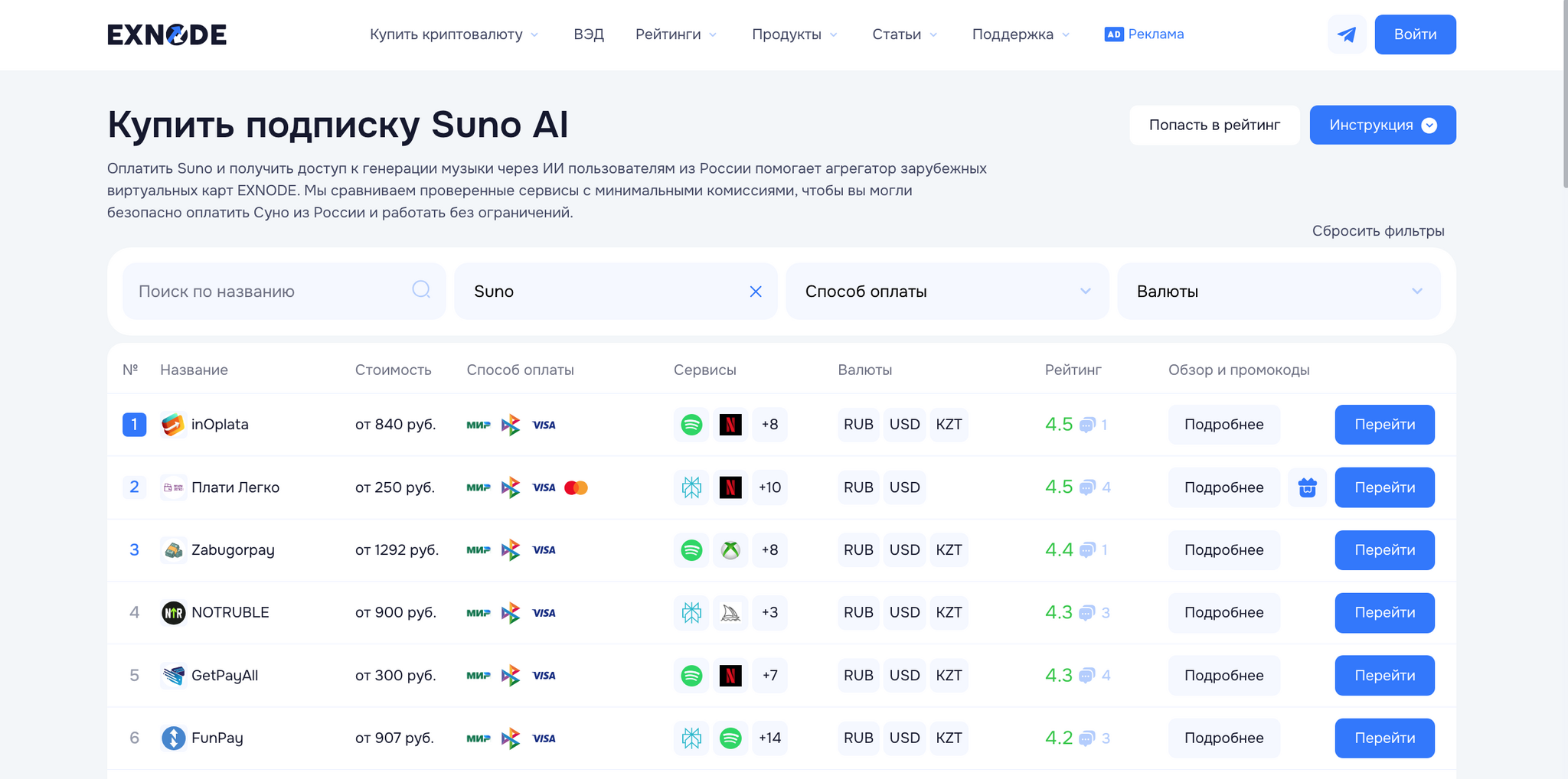 Чтобы быстрее сравнить условия площадок, их минимальные цены, поддерживаемые валюты и формат оформления, можно заранее открыть рейтинговый сервис Exnode — он помогает выбрать вариант, который подойдёт именно тебе. При аккуратном подходе покупка проходит спокойно, а Suno становится полноценным инструментом для творчества и работы.