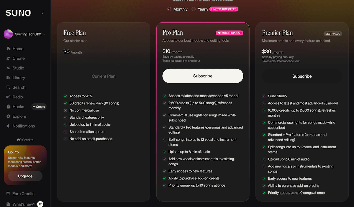 У Suno есть три официальных тарифных плана: Free, Pro и Premier. Они различаются по объёму доступных кредитов, скорости работы и общим возможностям генерации музыки. Ниже — краткое и понятное объяснение каждого уровня.