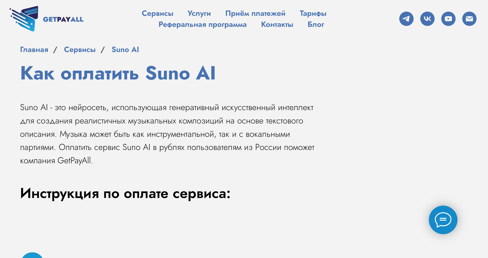 GetPayAll помогает оплачивать зарубежные сервисы, включая Suno, и работает через Telegram. Взаимодействие строится так же, как и у других сервисов этого формата: пользователь выбирает нужный тариф, пишет оператору в мессенджере и получает дальнейшие инструкции. Такой способ оформления удобен тем, что все шаги происходят в одном чате — от уточнения условий до получения данных для оплаты.