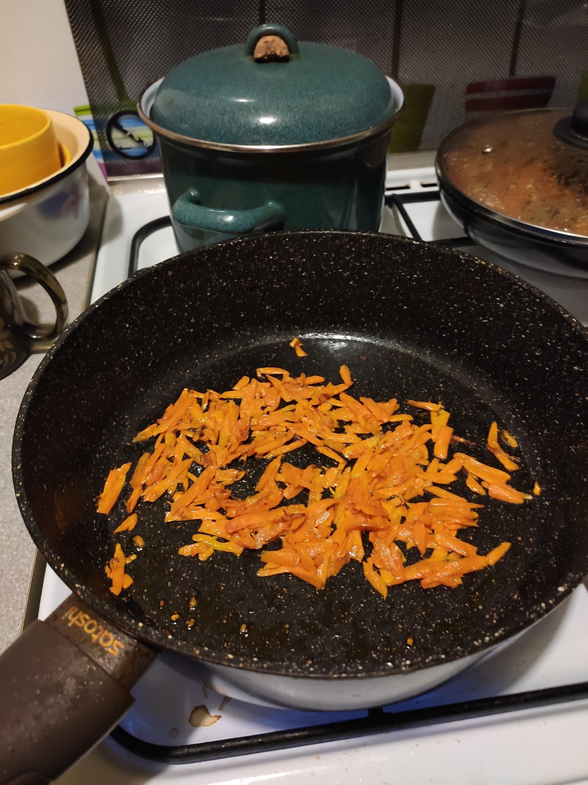 Морковку на сковородку, слегка обжариваем (время 17:32):