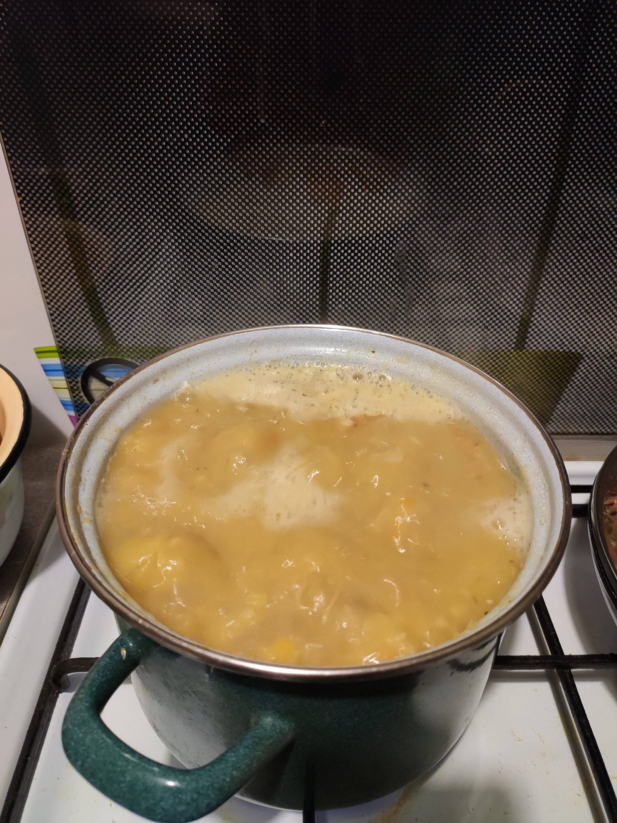 После закипания перемешиваем варево, дожидаемся когда закипит, сбавляем огонь до минимального и идем по своим делам, но периодически подходим и все перемешиваем, что бы горох не прилип ко дну кастрюли.
