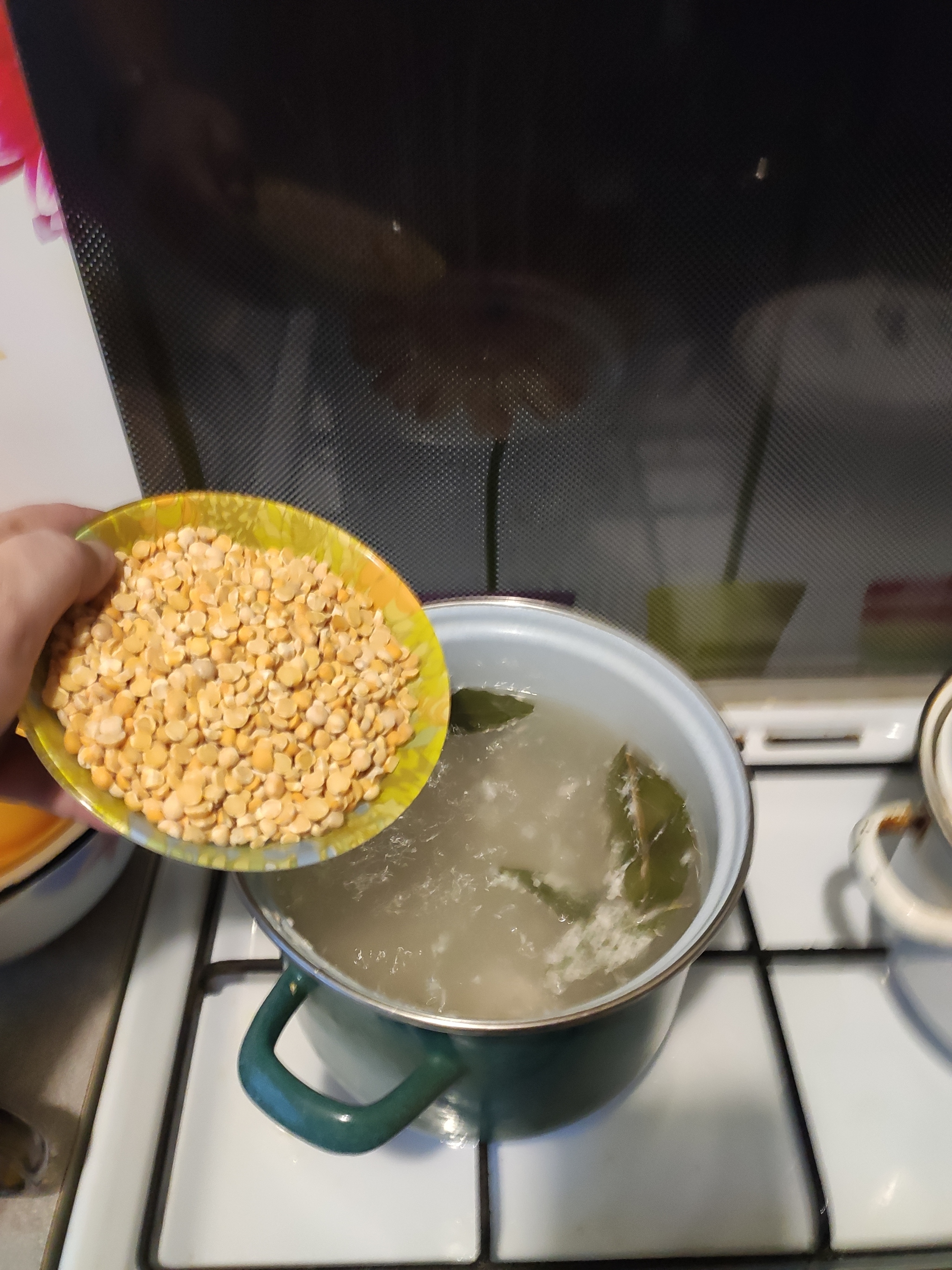 Огонь на полную, высыпаем горох в кастрюлю (время 15:48):