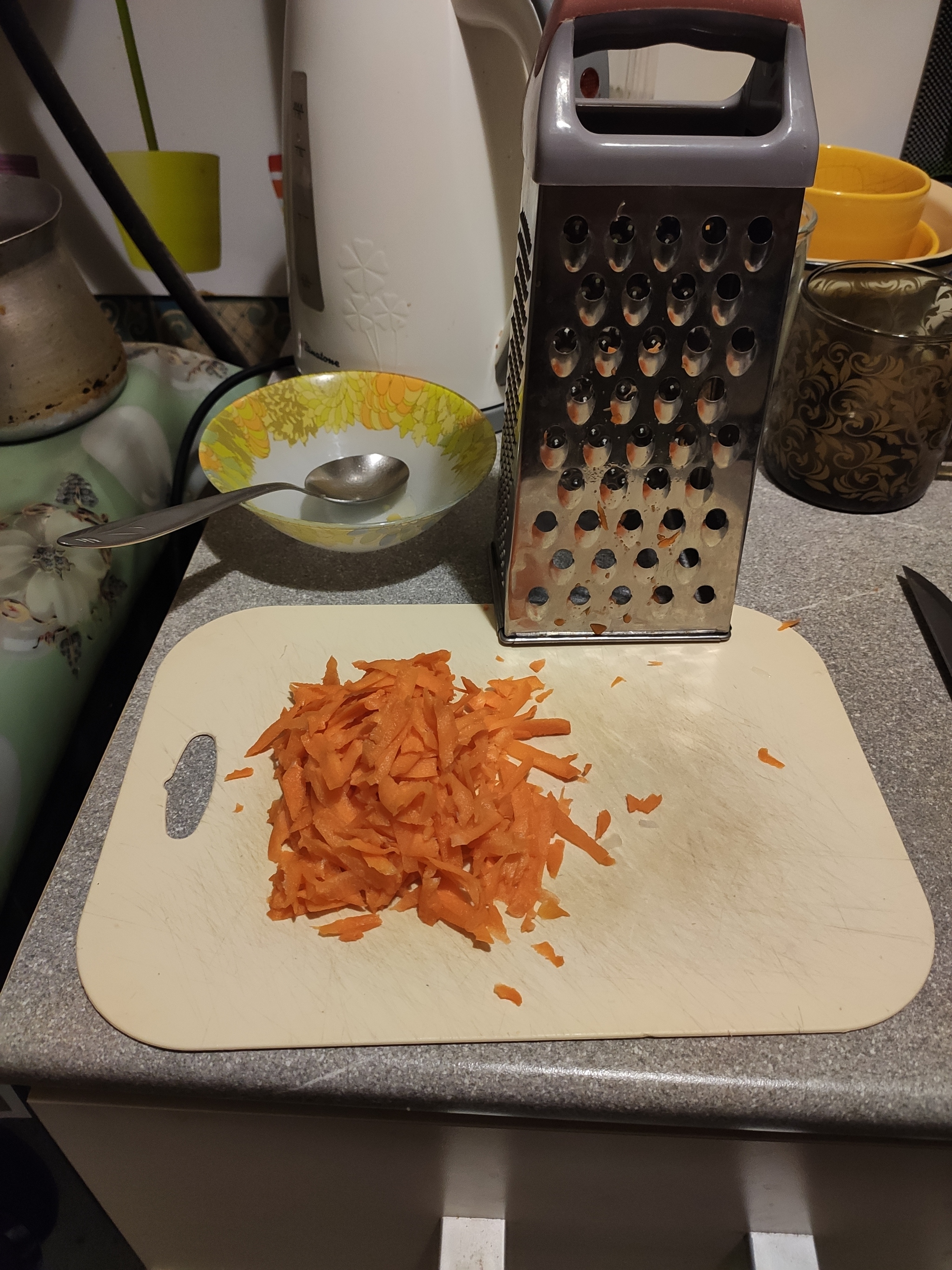 Натираем половину морковки на крупной терке (время 17:29):