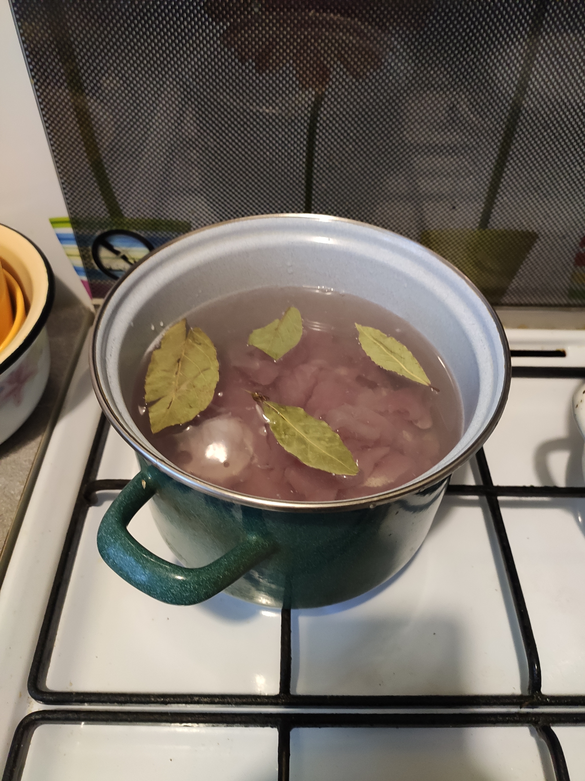 Наливаем в кастрюлю воды до половины или чуть больше, кладем мясо, чуть солим, добавляем лавровый лист и включаем огонь (время 15:34):