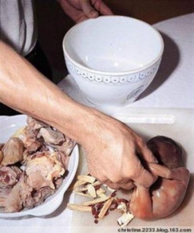 - Не волнуйтесь, это всего лишь мясо, и не более чем высокоразвитого животного, – приговаривала она во время процесса. Согласно обычаям региона, перед тем как быть приготовленными, зародыши обжигаются в горнах. Впрочем, некоторые китайцы-каннибалы предпочитают не новорожденных детей, а плаценту, она более доступна и продается всего за 10$. В некоторых ресторанах южной провинции Гуандун можно заказать очень популярное блюдо: суп из шести-семимесячного ребенка с лекарственными травами. Стоимость такого супа от 3000 до 4000 юаней.