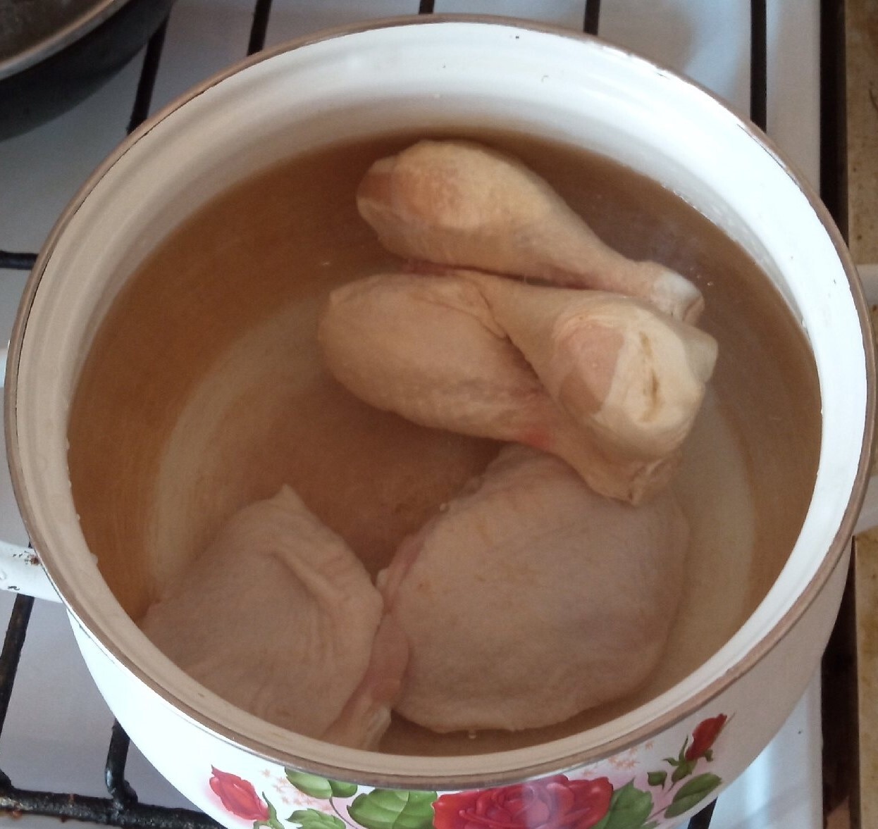 За это время разбираю бедра на мясо, измельчаю, закладываю в суп.