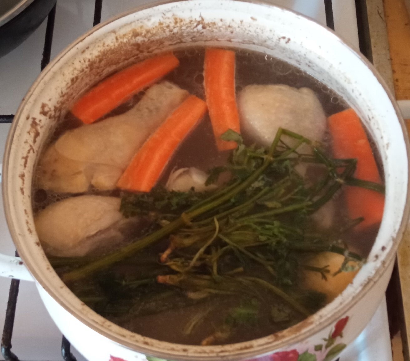 Оставляем на час. Можно и дольше, ну а если у вас суповая курица, или древний петух, который уже не топтал курочек и поэтому попал в суп, то варить бульон можно более 5 часов)
