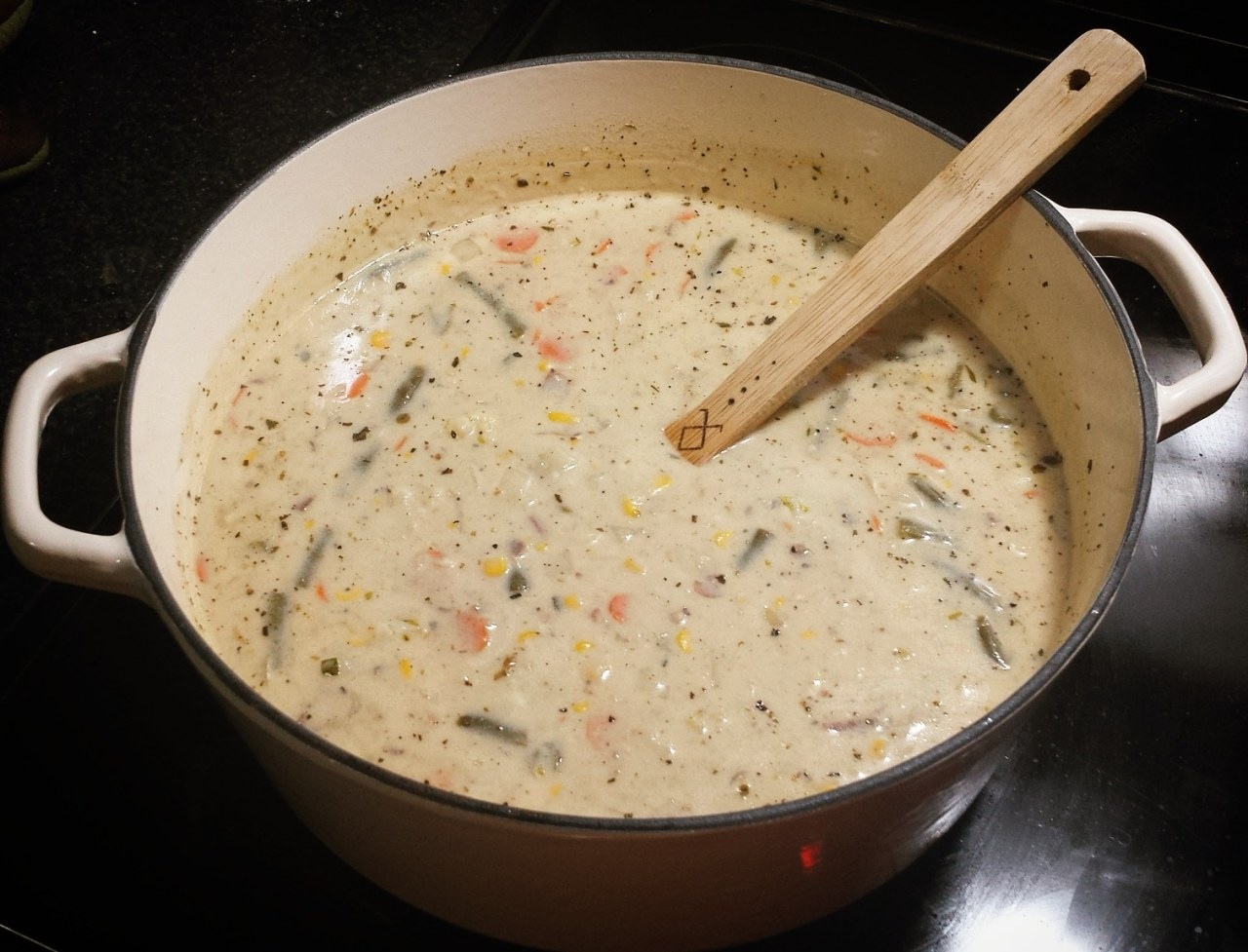Добавьте 5 чашек куриного бульона, доведите до кипения. Уменьшите огонь до слабого кипения, накройте крышкой и готовьте 20 минут.Убавьте огонь до минимума и дождитесь, пока кипение полностью прекратится, затем добавьте сливки или молока. Положите приготовленную курицу обратно и готовьте на слабом огне в течение пяти минут. Конец!