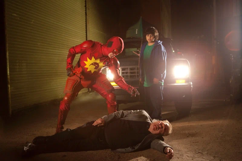 Отдельно хочу рассказать о гиковских отсылках в фильме. Их здесь достаточно много. Создавая образ Багряного Болта, Фрэнк изучает комиксы об известных супергероях без сверхспособностей вроде Бэтмена, Зелёной Стрелы и Железного человека. Героиня Пейдж Либби, доказывая Дарбо важность напарников героев, перечисляет таких персонажей, как Робин, Кид Флэш и даже Торо (сайдкик первого Человека-Факела). Шоу со Святым Мстителем отсылает на другой проект с Нэйтаном Филлионом, а именно "Музыкальный блог Доктора Ужасного" Джосса Уидона (который невероятно хорош и достоин просмотра).