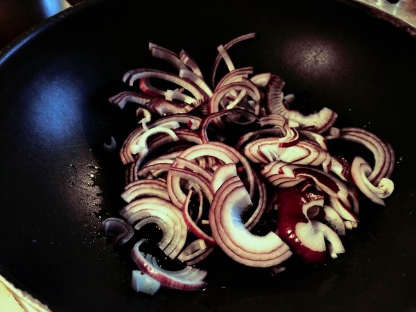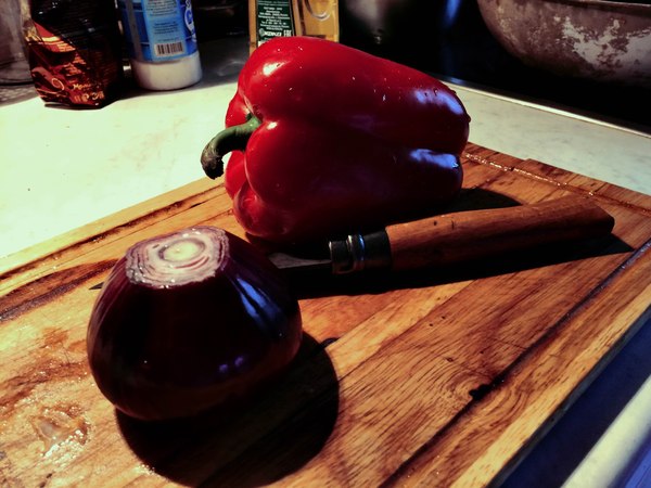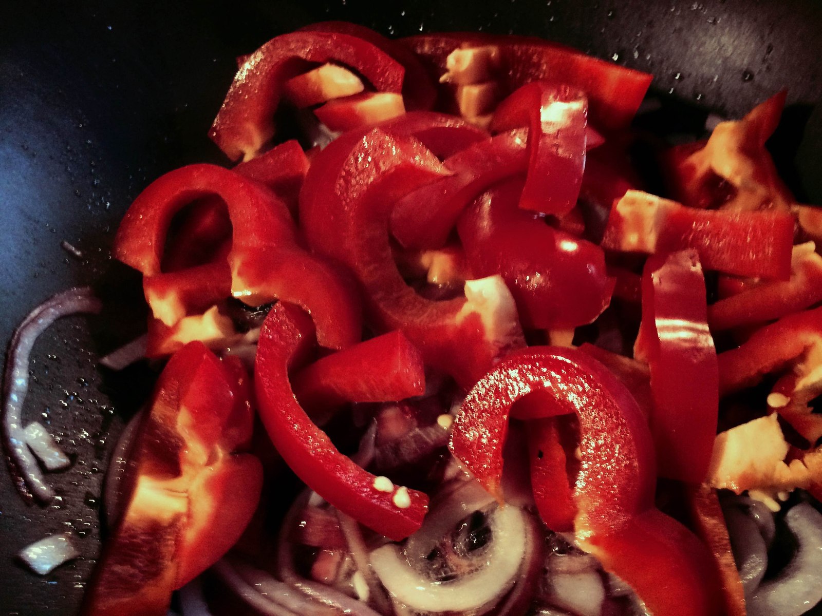 У меня мясо было уже готово, а это значит, что его можно добавить попозже, а начать с крупно нарезанных лука и сладкого перца.