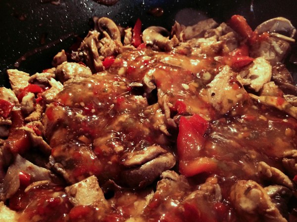 По прошествии заданного времени мы добавляем где-то 160 мл. кисло-сладкого соуса в наш вок и хорошенько размешиваем, убавляем температуру на минимум и оставляем ещё на 10 минут, в принципе, у нас уже всё готово, но дайте вкусам хорошенько смешаться.